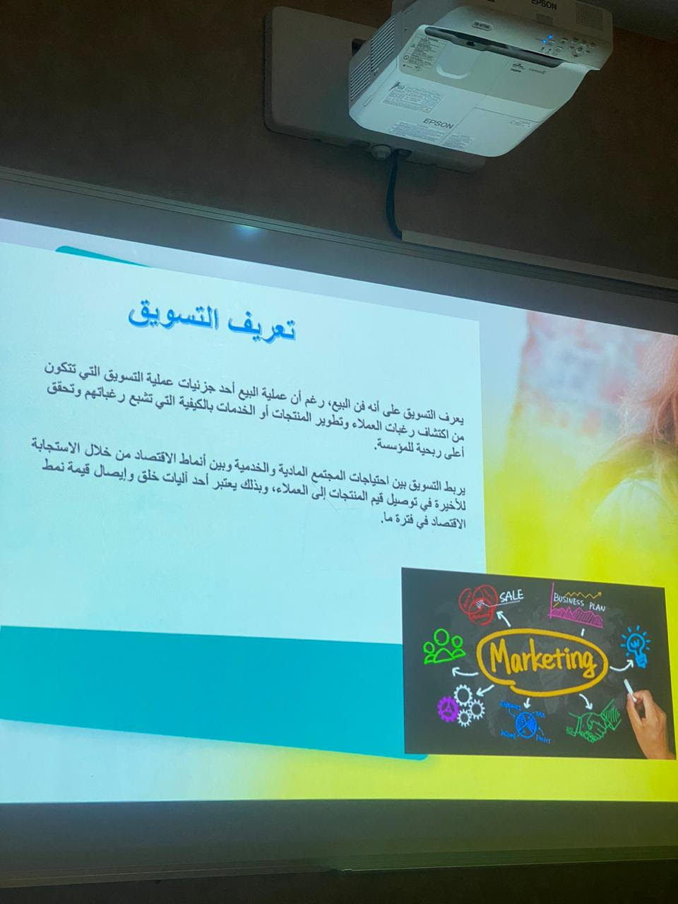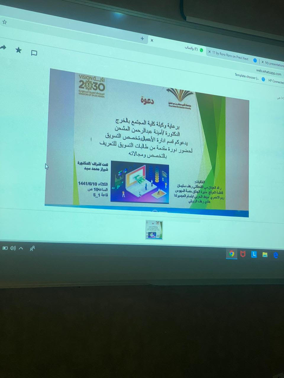تحت رعاية سعادة وكيلة الكلية الدكتورة / أمينة بنت عبدالرحمن المشحن ؛ وبحضور أعضاء هيئة التدريس والهيئة الإدارية وطالبات الكلية أقام قسم إدارة الأعمال لقاء تعريفي بتخصص التسويق وهو أحد التخصصات الجديدة التي تم إدراجها في قسم إدارة الاعمال بكلية المجتمع .