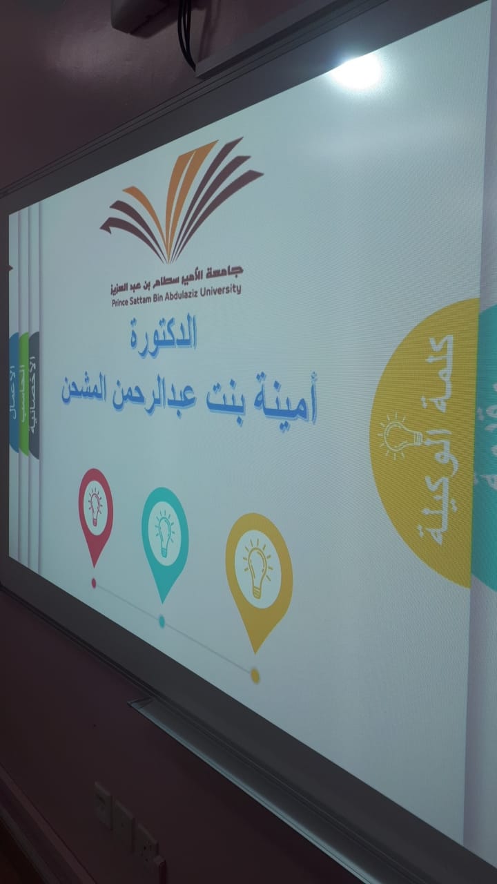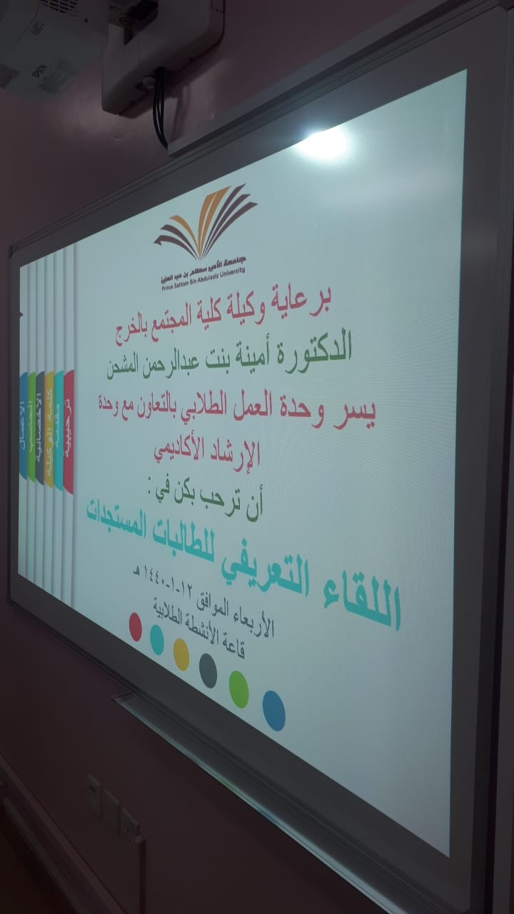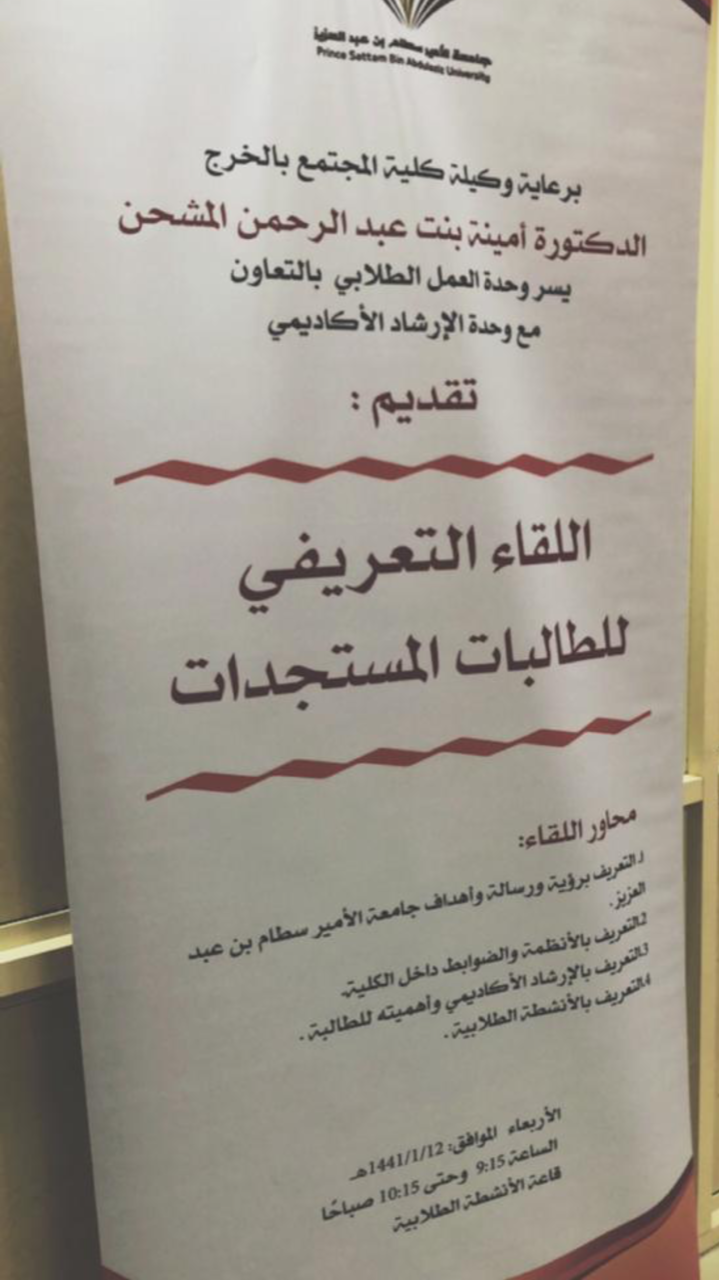 تحت رعاية سعادة وكيلة الكلية الدكتورة/ أمينة بنت عبدالرحمن المشحن، أقامت وحدة العمل الطلابي بالتعاون مع وحدة الإرشاد الأكاديمي، لقاء تعريفياً للطالبات المستجدات وذلك يوم الأربعاء الموافق ١٢/ ١/ ١٤٤١هـ.