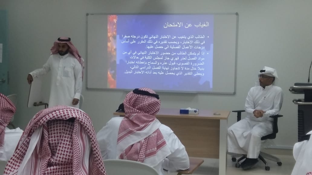 بعد ذلك قدم الدكتور / سلطان المخاريم ، وكيل الكلية للشؤون التعليمية والأكاديمية .. نبذة تعريفية بأنظمة الجامعة والسنة التحضيرية ، والتعريف كذلك بالأقسام الأكاديمية والبرامج المصاحبة، وطبيعة الأنشطة والفعاليات بالجامعة التي تستهدف الطلاب وكيفية تفاعل الطالب معها ومشاركته فيها .