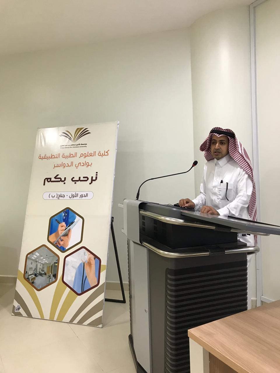 وبين ال بزيع أهمية استيعاب الطالب أنظمة الجامعة ، ومشاركته في أنشطة الكلية ، موضحاً احتياج سو ق العمل لأخصائي التمريض ضمن رؤية المملكة 2030 .