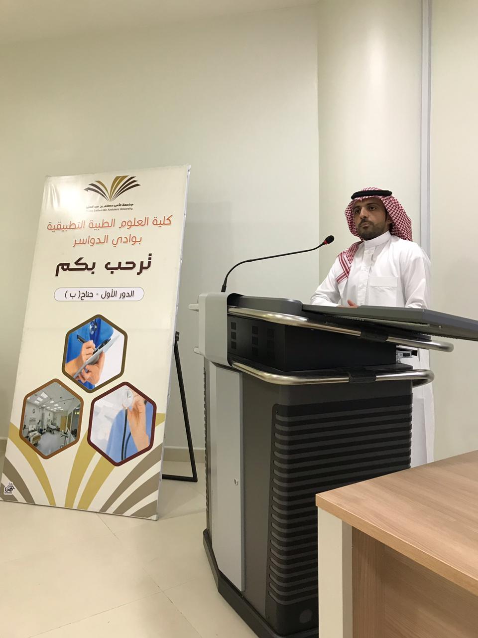اقامت كلية العلوم الطبية التطبيقية بوادي الدواسر اليوم الأثنين الموافق 1440/1/3هـ ، اللقاء التعريفي للطلاب المستجدين حيث يمثلون الدفعة الثانية في قسم علوم التمريض .