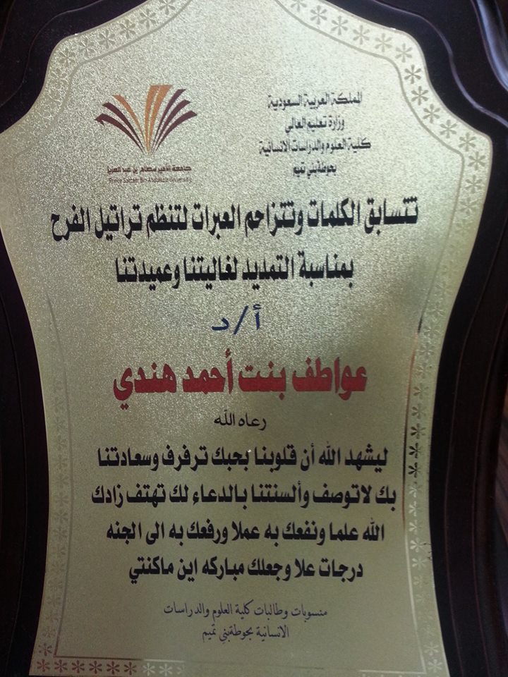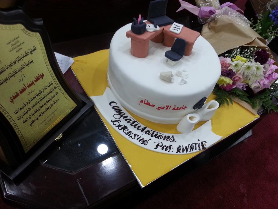 وتقدمت وكيلة الكلية بتسليم العميدة درعا من منسوبات الكلية وباقة زهور تقديرا وحبا لها .