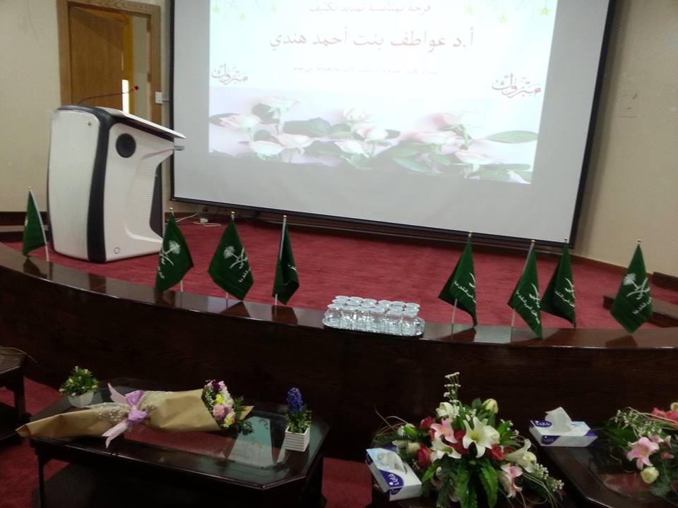 ثم تهنئة الأستاذة/ فوزية جمعة نيابة عن إداريات الكلية والتي قدمت فيها أجمل التهنئات والشكر ، فلكل نجاح شكر وتقدير.