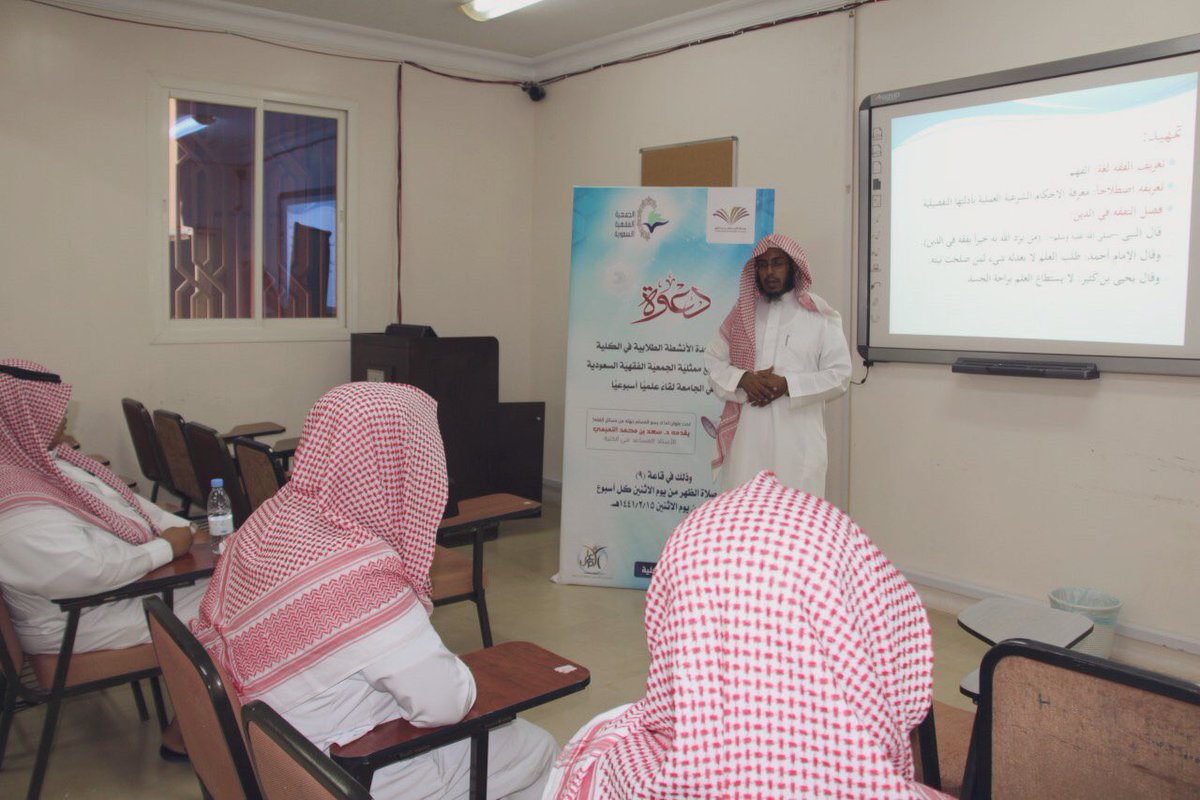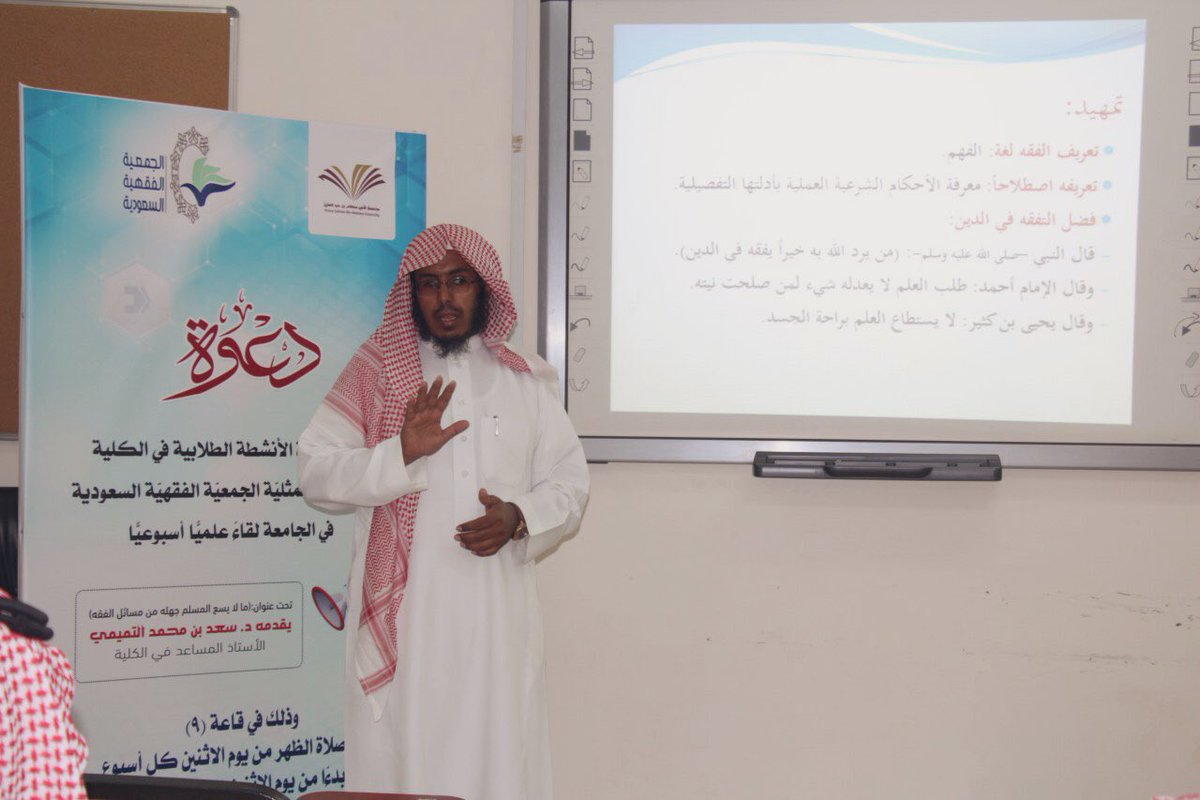 تنظم كلية إدارة الأعمال بحوطة بني تميم بالتعاون مع ممثلية الجمعية الفقهية السعودية بالجامعة لقاء علمي أسبوعي بعنوان ((ما لا يسع المسلم جهله من مسائل الفقه)) يقدمه سعادة الدكتور/ سعد بن محمد التميمي - الاستاذ المساعد بالجامعة، والذي سيعقد كل يوم اثنين بعد صلاة الظهر في قاعة رقم 9