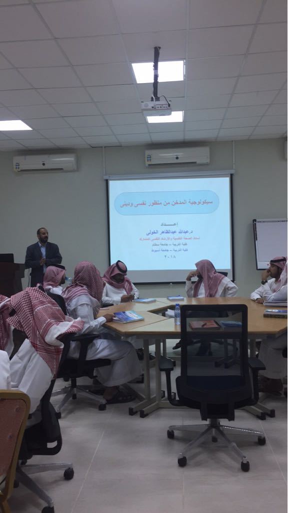 بتوجيه من عميد كلية التربية بوادي الدواسر الدكتور / ناصر بن محمد أل عشوان ، قدمت وحدة الإرشاد النفسي والتربوي بقاعة التدريب بالكلية فعالية ندوة بعنوان ( سيكولوجية المدخن من منظور نفسى وديني) ، وقدم هذه الندوة د. عبدالله الخولى أستاذ الصحة النفسية المشارك بقسم العلوم التربوية ، و د.عادل عيد أستاذ الفقه المقارن المساعد بقسم الدراسات الإسلامية .