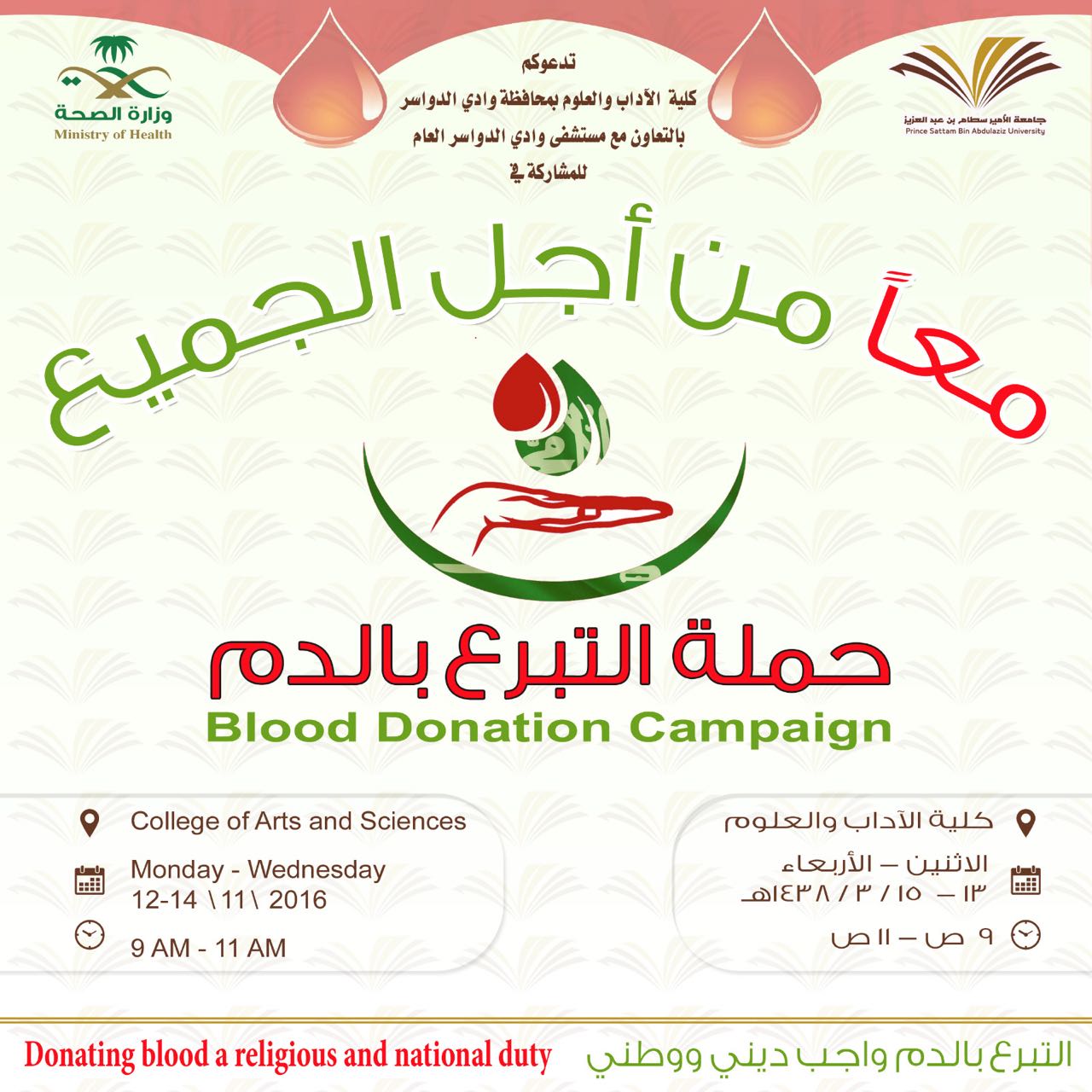 تعتزم كلية الآداب والعلوم بوادي الدواسر وبالتعاون مع مستشفى الوادي العامة بالمحافظة إطلاق حملة لتبرع بالدم يوم الاثنين الموافق 1438/3/13هـ لمدة ثلاثة أيام لكافة منسوبي الكلية الراغبين بالتبرع بالدم ، وتأتي هذه الحملة انطلاقا من مبدأ المساعدة الإنسانية وروح المواطنة العالية التي تميز بها شعبنا السعودي ودعما لشعار الحملة (معا من أجل الجميع )