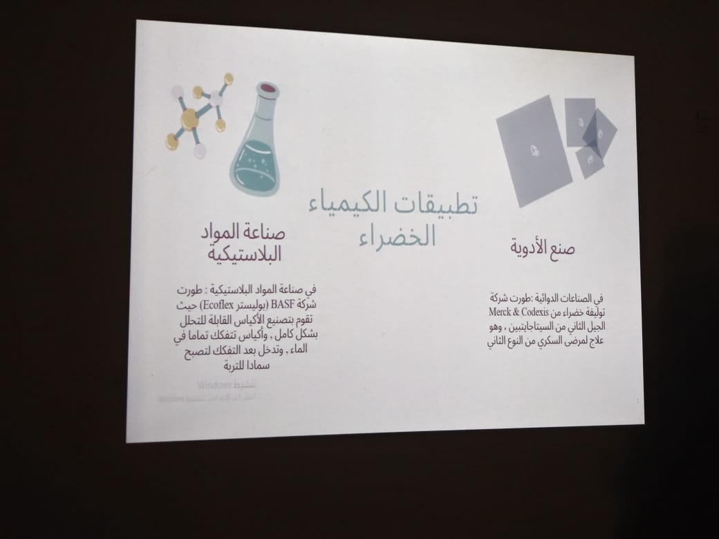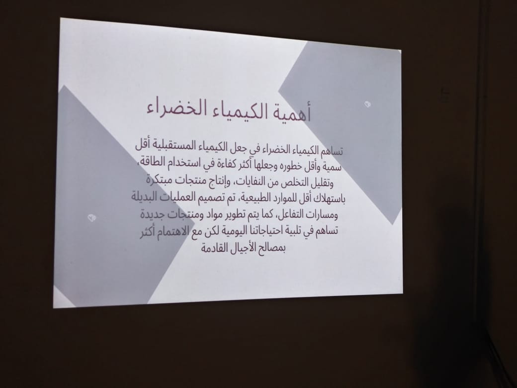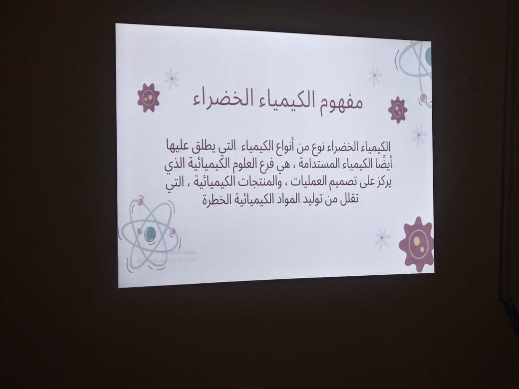 على الرغم من أن الكيمياء تمثل العالم من حولنا تقربيًا، ولكن هناك بعض المواد الكيميائية والتي تمثل خطرًا كبيرًا على صحتنا وحتى البعض منها قد يؤثرعلى حياة الإنسان. لذلك نظم نادي العلوم الأساسية ببرنامج السنة التحضرية نشاط بعنوان " الكيمياء الخضراء " يوم الثلاثاء الموافق 14444/7/9هـ،تقديم طالبات صحي المستوى الثاني بالعمادة تحت إشراف الدكتورة حنان فراج. وقد اشتمل النشاط على عدة أهداف منها:- مفهوم الكيمياء الخضراء، مبادئ الكيمياء الخضراء ومنها تجنب المخلفات ، تصنيع مواد كيميائية اكثر أمناً ، استخدام مواد قابلة للتحلل. أصبحت الوقاية من التلوث من الأمور التي تنادي بها جميع دول العالم. كما وضحت أهمية الكيمياء الخضراء ، واشتمل النشاط على بعض تطبيقات الكيمياء الخضراء . كما تضمن النشاط فوائد الكيمياء الخضراء ، أنها تقلل من التلوث وبالنهاية شارك الحضور فى مناقشة تفاعلية بها ولاقى النشاط تفاعلاً مثمراً.