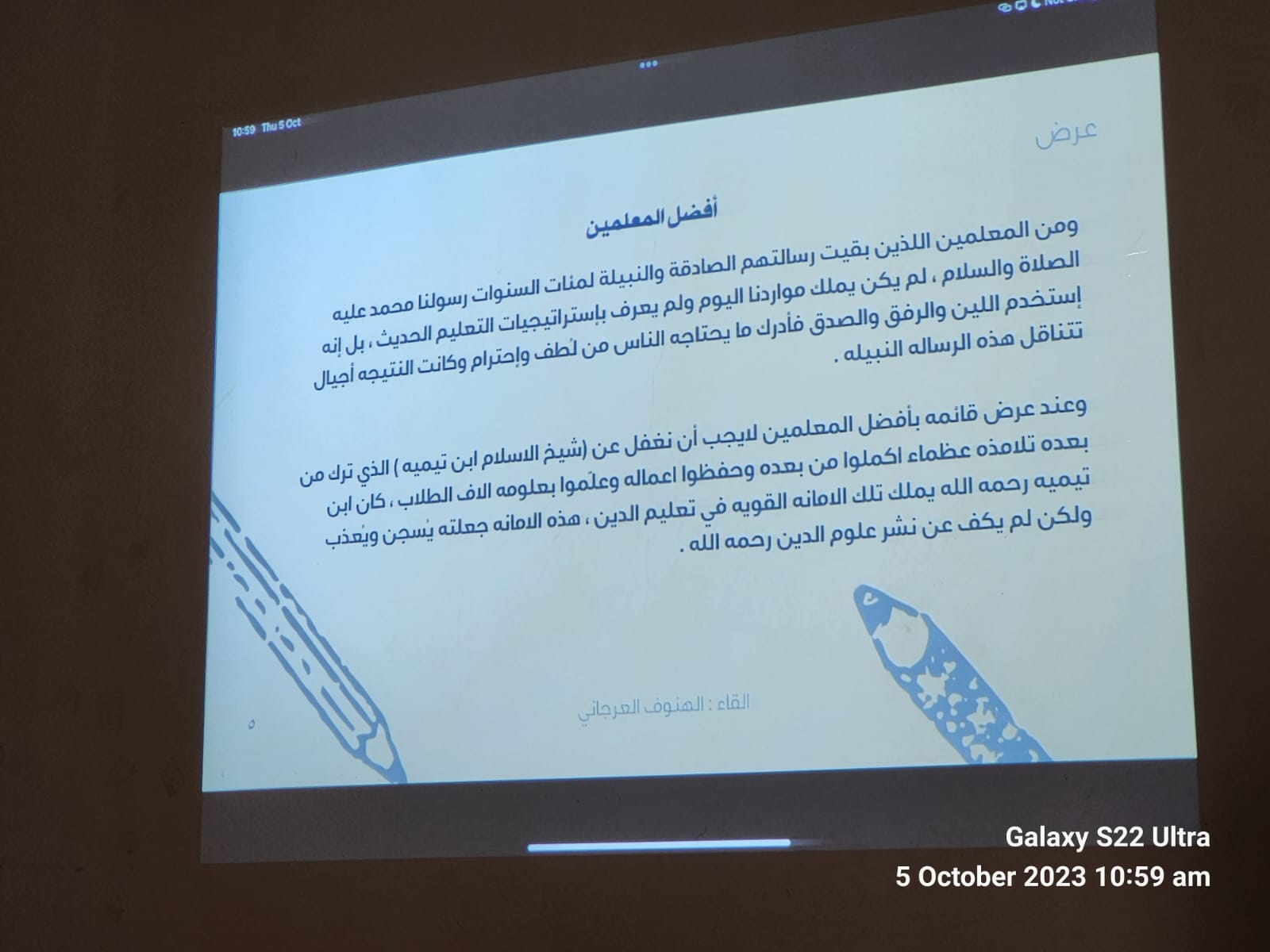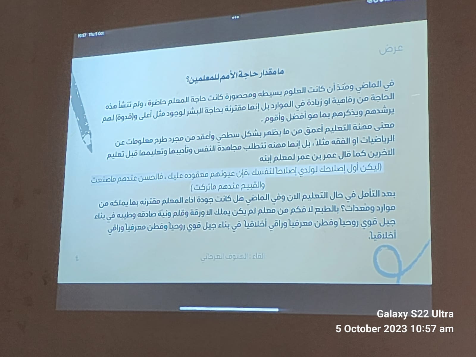 تم تقديم عرض اُستعرض فيه تاريخ المعلم، واستعراض للدور الكبير والمؤثر للمعلم في بناء شخصيات الطلاب وتنميتها ، واختتم اللقاء بإلقاء أبيات شعرية، و لقاء مع الأستاذة رجاء عبدالفتاح عن مسيرتها في التعليم الجامعي كما قامت وحدة العمل الطلابي بتوزيع ورود وعبارات شكر وثناء لمنسوبات العمادة. وقد لقيت الفعالية رضا واستحسان الحضور من منسوبات وطالبات العمادة.