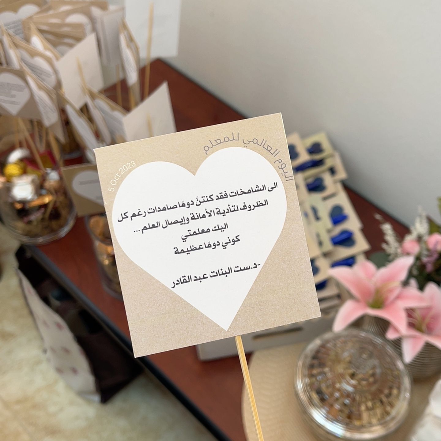 قُم لِلمُعَلِّمِ وَفِّهِ التَبجيلا كادَ المُعَلِّمُ أَن يَكونَ رَسولا من أروع ما قاله الشعراء عن المعلم، نهنئ من القلب رافعوا منار العلم، وصناع الأجيال لمن أشعلوا قناديل العلم والمعرفة وذلك بمناسبة اليوم العالمي للمعلم، وعرفانًا منا وتقديرًا لفضلهم الكبير، نظمت وحدة العمل الطلابي في برنامج السنة التحضيرية -قسم الطالبات بالتعاون مع وحدة العمل التطوعي بإشراف رئيسة العمل الطلابي أ. ريما النفيعي ومشرفة العمل التطوعي د. مروه سلامة فعالية بعنوان " شكراً لك"، وذلك يوم الخميس الموافق 20-3-1445هـ بحضور منسوبات وطالبات العمادة.