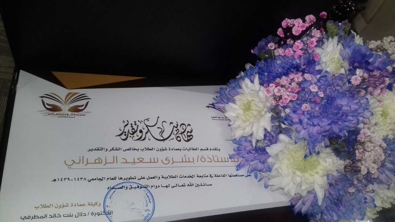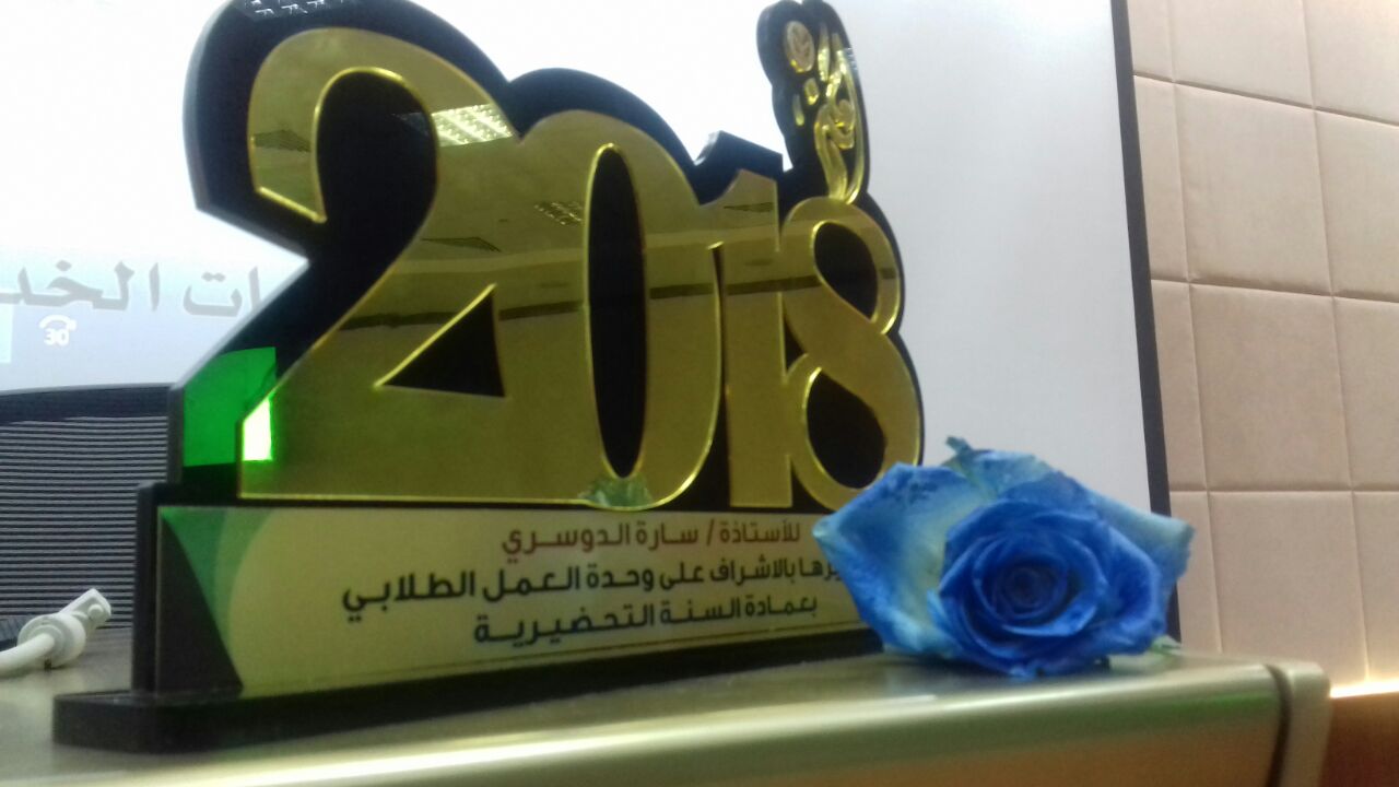 ٤-درع التميز للأستاذة سارة الدوسري لتميزها بالإشراف على وحدة العمل الطلابي بعمادة السنة التحضيرية.