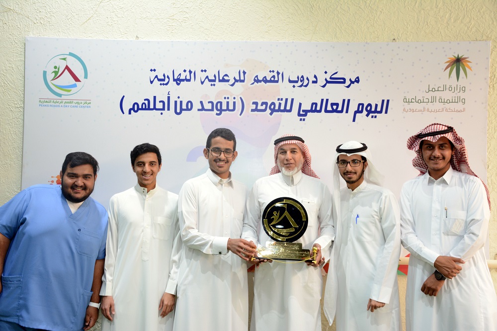بهدف تعزيز برامج الدمج بين عمادة السنة التحضيرية و المجتمع المحلي ،وضمن أجواء الإحتفاء باليوم العالمي للتوحد نظمت العمادة زيارة إلى مركز دروب القمم للرعاية النهارية يوم الأربعاء الموافق 18/7/1439هـ ،وشاركت في تقديم برامج تربوية وترفيهية وفقرات إنشادية لمستفيدي المركز رسمت على وجوههم ألوان الفرح والسعادة، وبهذه المناسبة الغالية قدم المركز درعاً تذكارياً لعمادة السنة التحضيرية تعبيراً عن شكرهم وامتنانهم لقيامهم بمثل هذه المبادرات الهادفة .