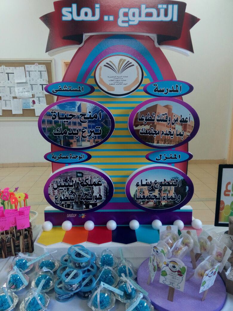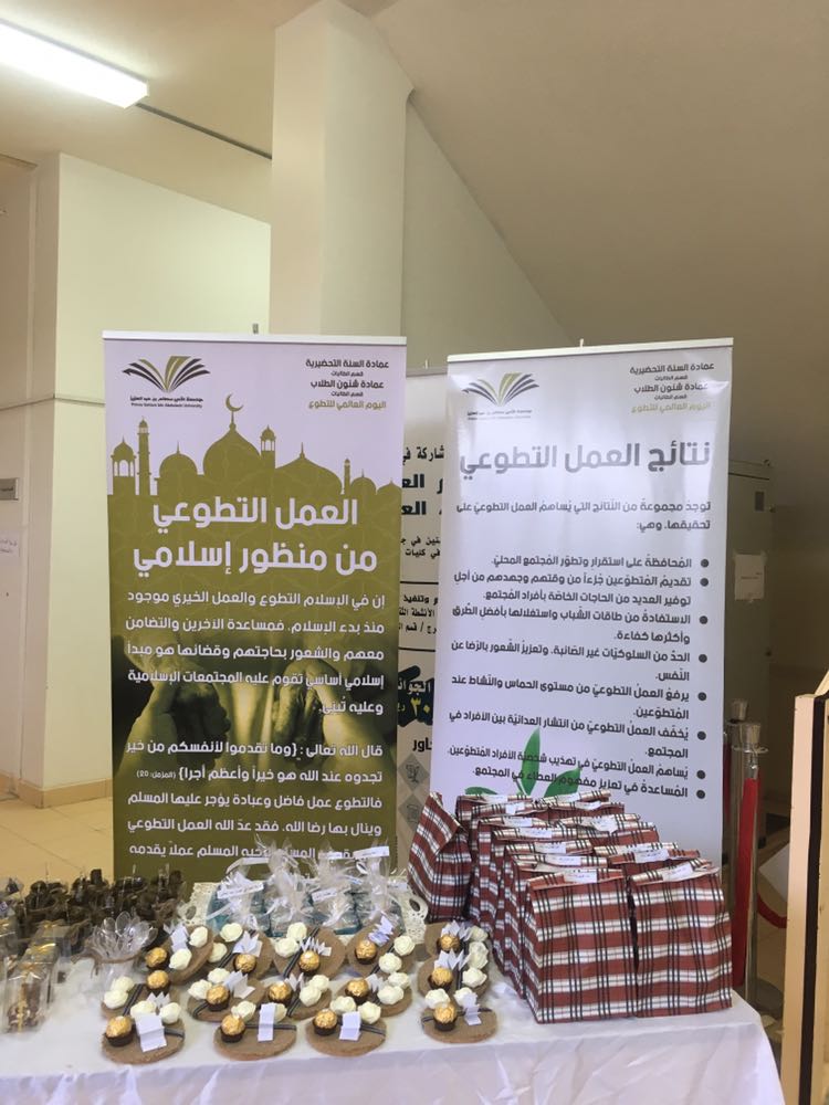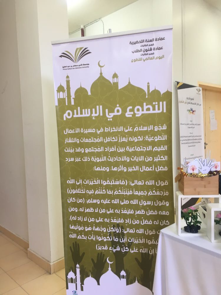 تزامناً مع اليوم العالمي للتطوع ،احتفت عمادة السنة التحضيرية بالتعاون مع عمادة شؤن الطلاب -قسم الطالبات برعاية وحضور الدكتورة نورة الزعاقي المشرفة على الوحدة الإشرافية بوكالة الجامعة للشؤن التعليمية والأكاديمية وحضور الدكتورة دلال المطرفي وكيلة عمادة شؤن الطلاب - قسم الطالبات والدكتورة أمل بنت صالح الشمراني وكيلة عمادة السنة التحضيرية يوم الأربعاء الموافق ٢٥-٣-١٤٣٩هـ (باليوم العالمي للتطوع) وذلك بمشاركة العديد من الجمعيات التطوعية خارج وداخل محافظة الخرج وذلك بتنظيم وإشراف وحدة العمل الطلابي بعمادة السنة التحضيرية.