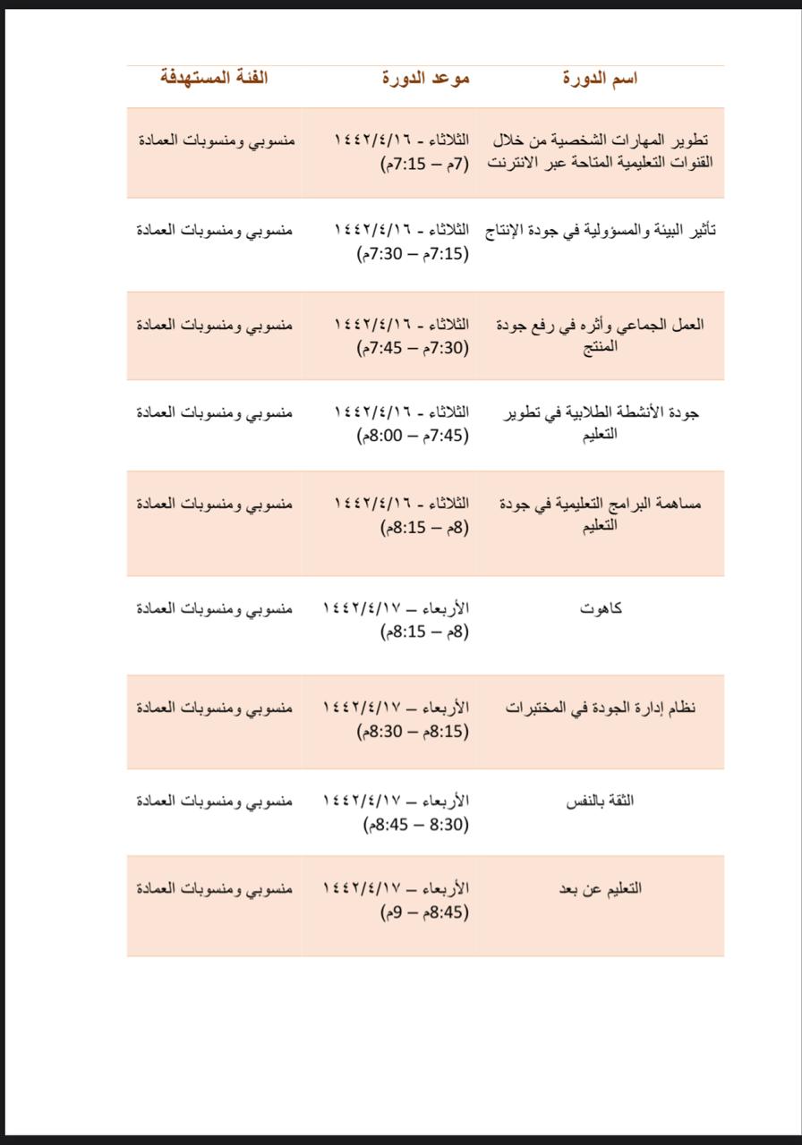 وقد بدأ حفل الافتتاح بكلمة افتتاحية لسعادة الوكيلة وحضر الحفل عدد كبير من الطالبات والعضوات من منسوبات العمادة ومن الدورات المقدمة كما يلي: