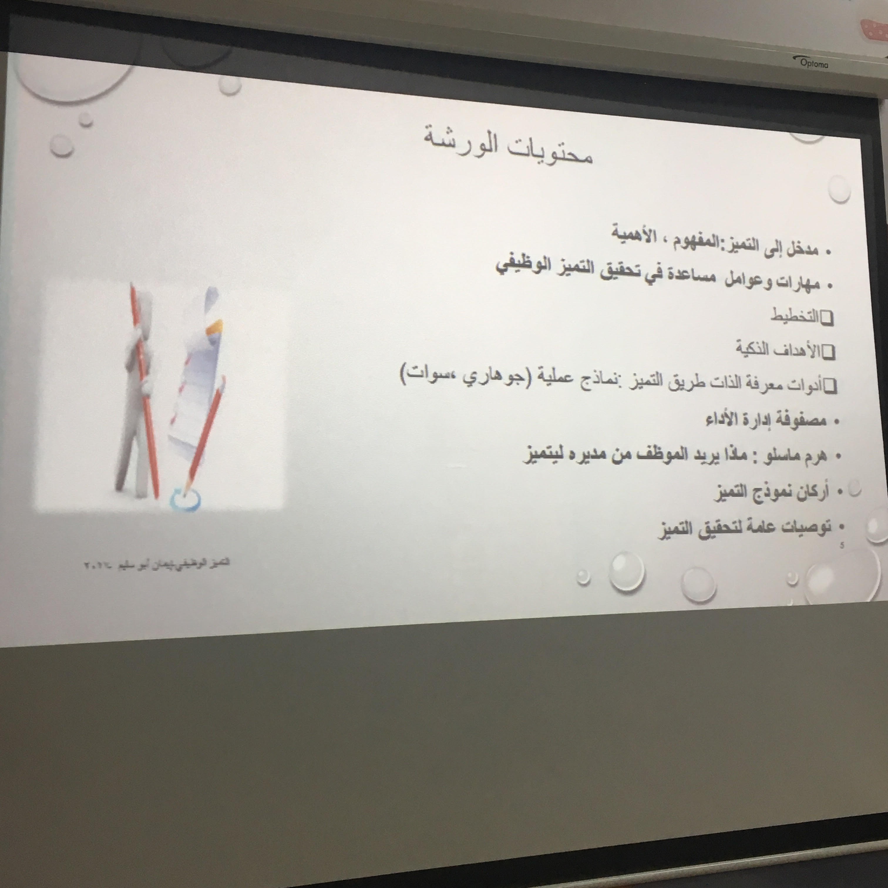 وقد ابتدأ البرنامج بدورة تدريبية بعنوان "التميز الوظيفي " للدكتورة إيمان أبو سليم حيث هدفت الدورة اكساب المشاركات المعلومات والمعارف اللازمة لتمكينهن من التميز الوظيفي في أعمالهن اليومية وقد أحتوى برنامج الدورة على مفهوم وأهمية التميز الوظيفي ,مهارات وعوامل مساعدة في تحقيق التميز الوظيفي مثل التخطيط والأهداف الذكية وأدوات معرفة الذات طريق التميز