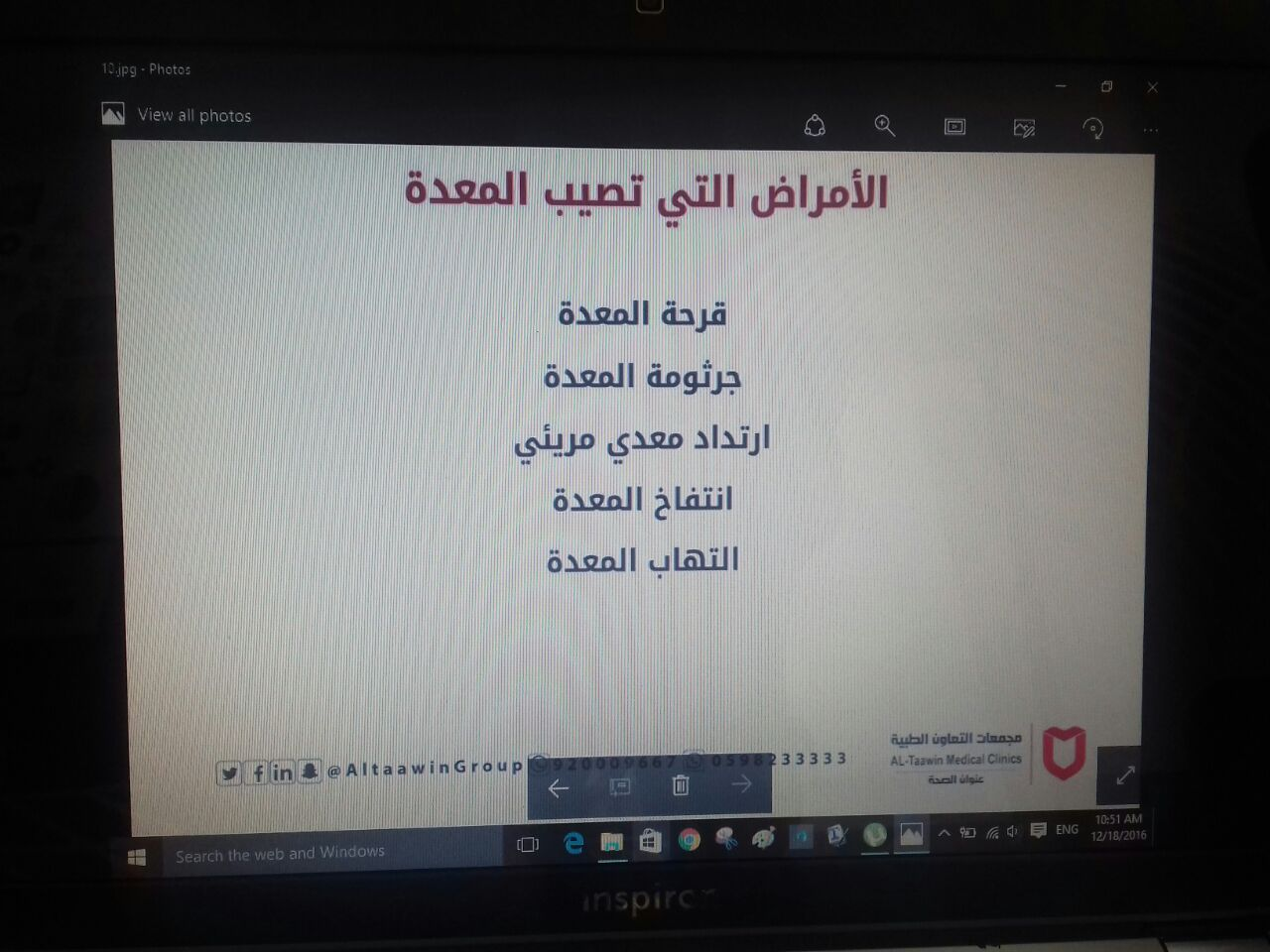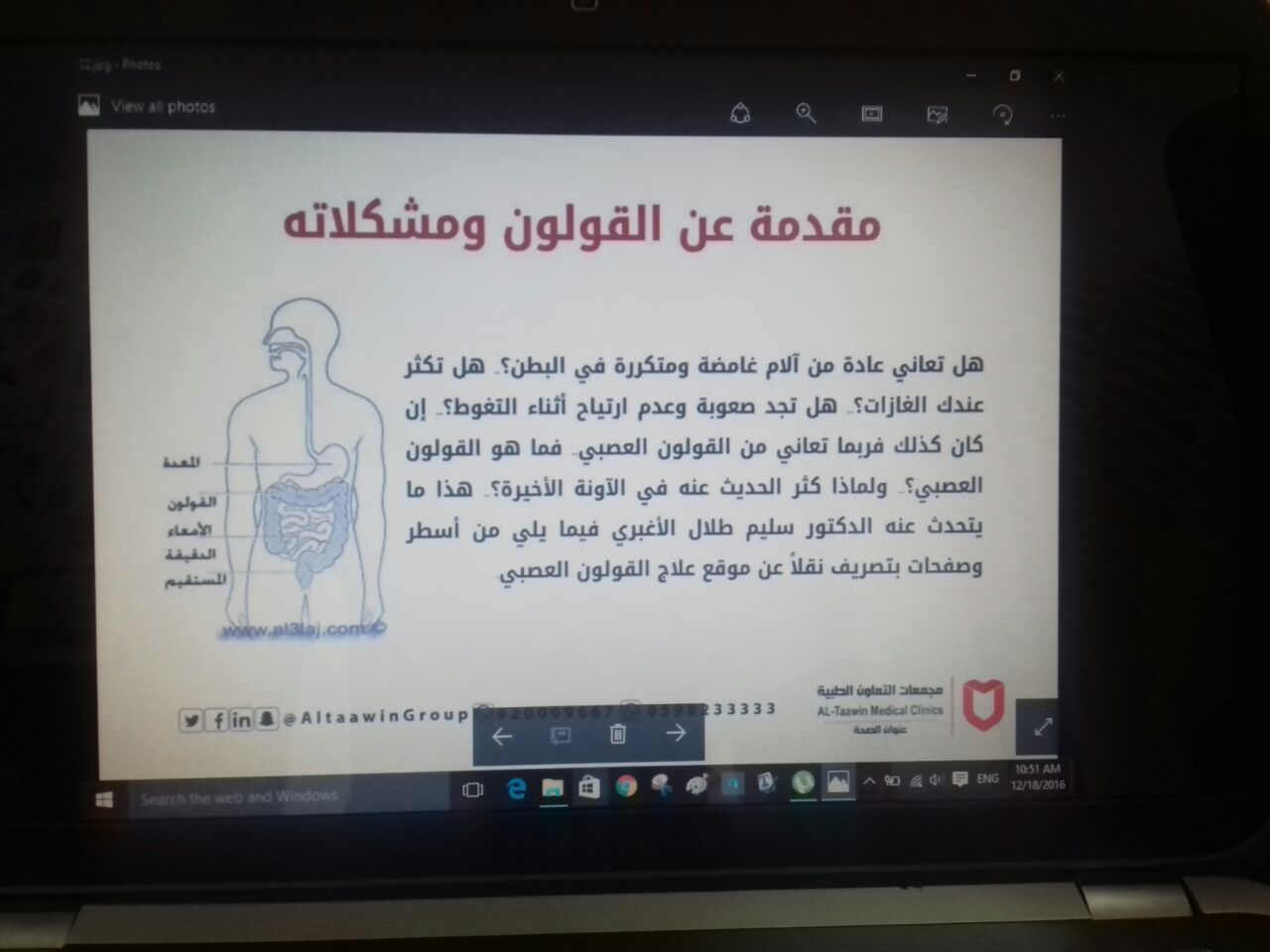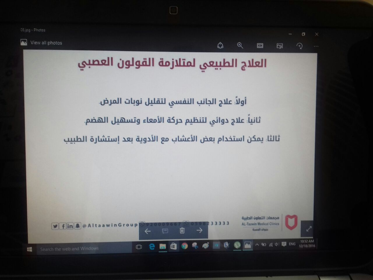 حيث قامت الدكتورة نجوان محمد مشكورة، بالعرض المفصل عن القولون وأهم مشاكله والوقاية منه...وقامت مجموعة من الحضور بإثارة مجموعة من الأسئلة والاستفسارات قامت الدكتورة بالرد عليها ، وتم توزيع بطاقات لفحص جرثومة المعدة كخدمة مقدمة من مركز التعاون الطبي .