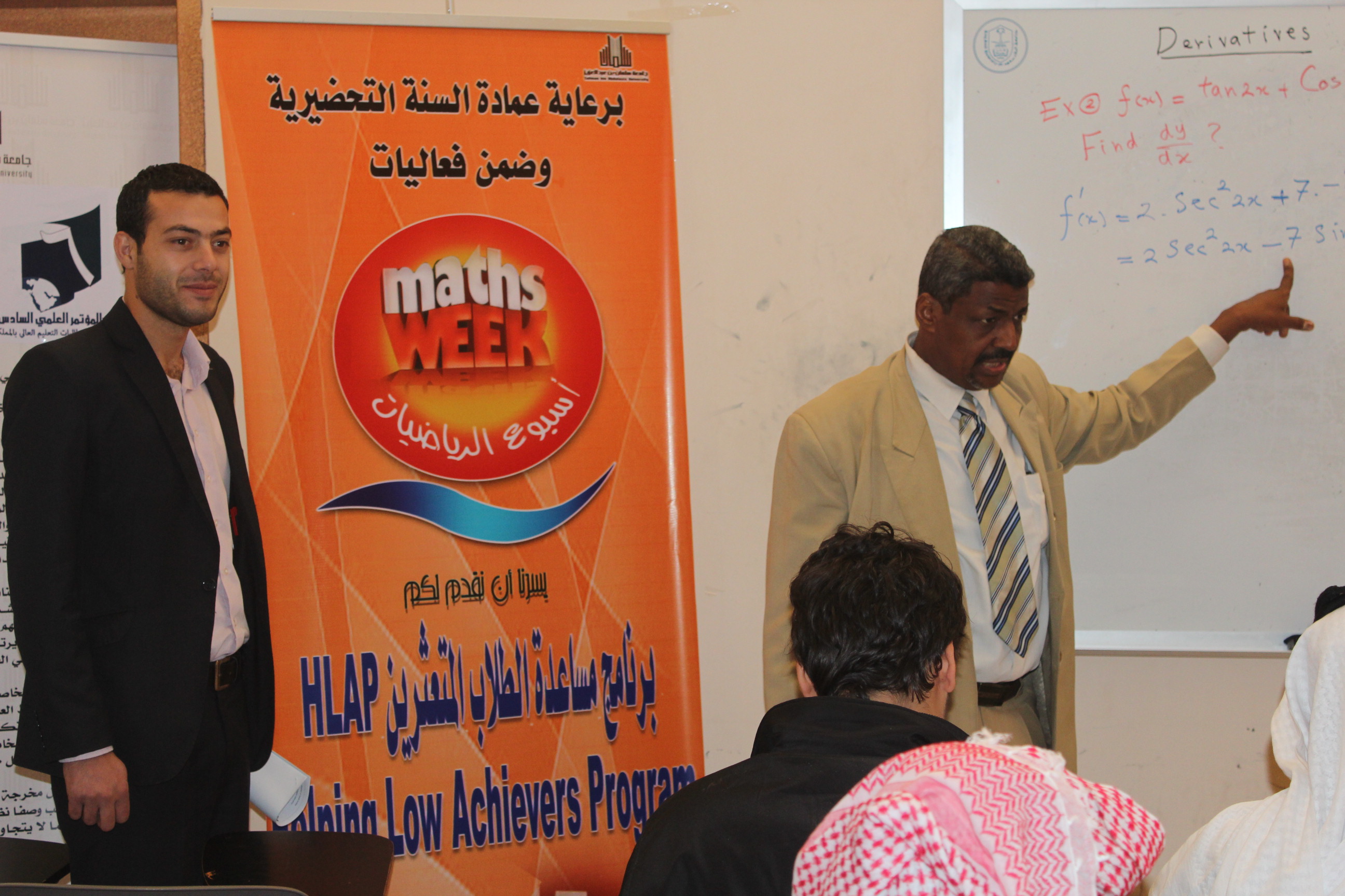 قامت شعبة الرياضيات بتنظيم برنامج لمساعدة الطلاب المتعثرين بالتنسيق مع وحدة الارشاد الأكاديمي، وذلك للارتقاء بمستوى طلاب السنة التحضيرية ومساعدتهم على اجتياز مقررات الرياضيات بنجاح ، علما بأن برنامج رعاية الطلاب المتعثرين مستمرا حتى نهاية الفصل الدراسي الأول.