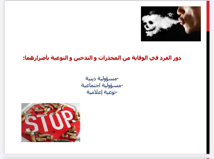 لا يخفى على الجميع خطر المخدرات في المجتمعات و بين فئة الشباب ودوره الكبير في تشتت الأسر وإحداث أضرار جسدية قد تؤدي إلى الوفاة. ولما للتعليم من دور كبير في توعية الفرد والمجتمع فقد نفذت عمادة السنة التحضيرية -قسم الطالبات، برنامج توعوي بعنوان: " أضرار التدخين والمخدرات ودور الفرد في الوقاية منها" بالتنسيق مع لجنة العمل المشترك و المديرية العامة لمكافحة المخدرات في يوم الأربعاء الموافق 10-4-1442 هـ ، تحت إشراف منسقة البرامج التوعوية من أضرار المخدرات وآفة التدخين الأستاذة مها الشمري و تقديم المدربة أ. مرام الحربي.