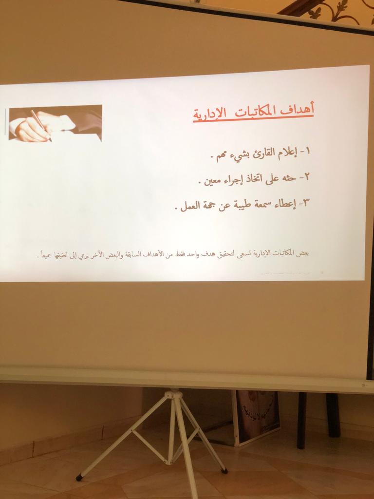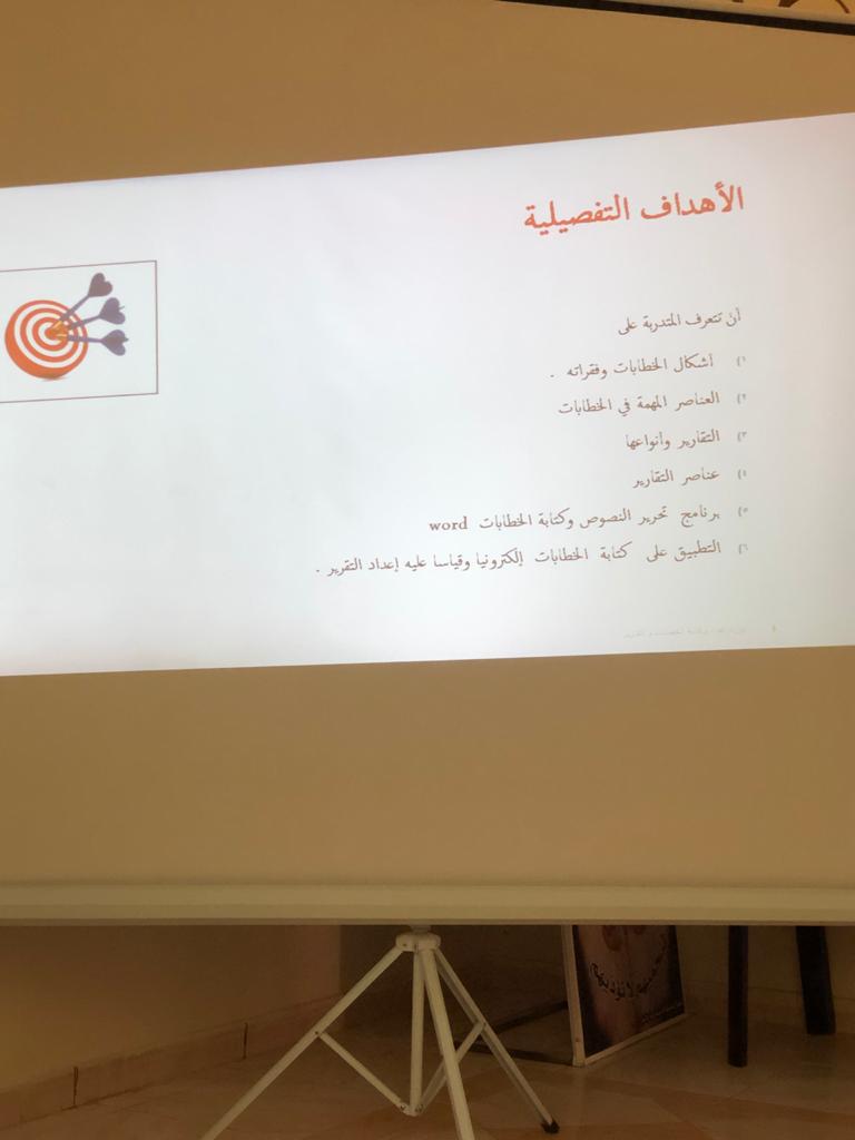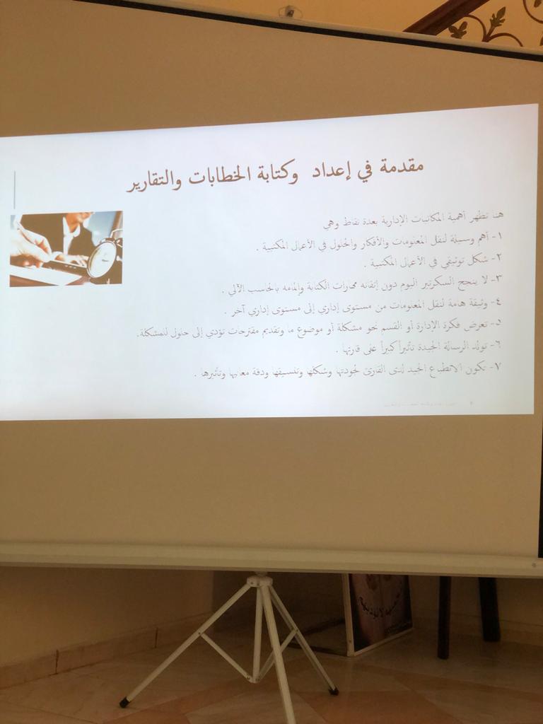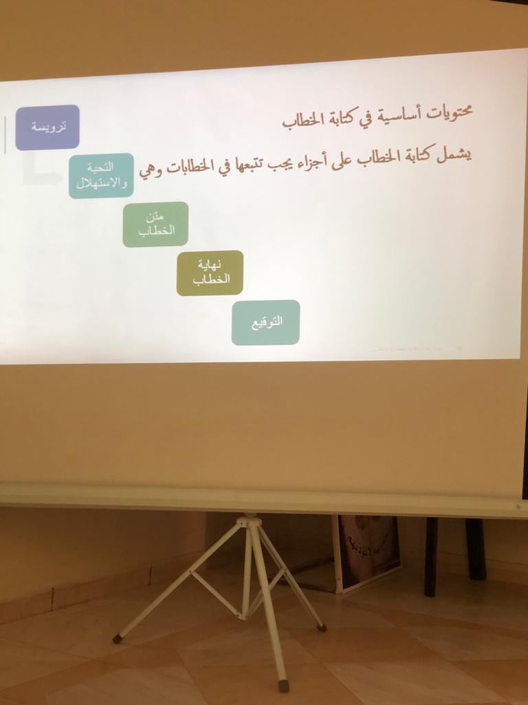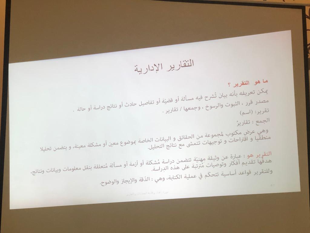 نظراً لأهمية سلامة الخطابات الرسمية والتقارير واعتبارها معيار الحكم على مدى كفاءة المؤسسة وبهدف تطوير القدرات وتنمية المهارات الإدارية نظمت عمادة السنة التحضيرية _قسم الطالبات دورة تدريبية بعنوان"إعداد وكتابة الخطابات والتقارير" قدمتها أ.حنان الحربي، وذلك يوم الأربعاء الموافق 1441/7/9هـ،في مركز مكافحة التسول بالخرج حيث تناولت الدورة عدة محاور من أهمها (تعريف الخطابات والتقارير ،وأهميتها وأقسامها وماهي خطوات كتابة الخطابات والتقارير، كما تم عرض بعض النماذج للخطاب والتقارير) وتبادلت المدربة مع الحضور حورات مميزه وأنشطة فعالة.