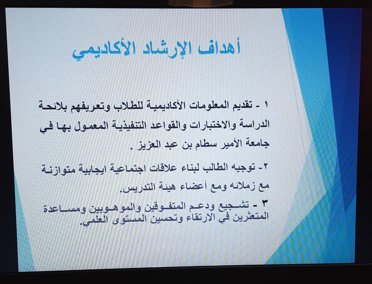 يتحمل عضو هيئة التدريس مسؤولية الإرشاد الأكاديمي باعتباره متخصص أكاديمي له احتكاك مباشر بالطالب ومعرفته بالاحتياجات الأكاديمية والتربوية والنفسية للطلاب, وبالتالي يفترض أن يكون لدى عضو هيئة التدريس معلومات كاملة عن المشكلات الأكاديمية التي يمكن أن يتعرض لها الطالب وكيف يمكن حل هذه المشكلات وفق الضوابط واللوائح. لذلك نظمت وحدة الارشاد الأكاديمي بعمادة السنة التحضيرية قسم الطالبات يوم الخميس الموافق 1443/1/18 هـ لأعضاء هيئة التدريس فعالية من خلال البرنامج التثقيفي في الإرشاد الأكاديمي , قدمتها الأستاذة: رجاء عبدالفتاح، تحدثت فيها عن عدة محاور أهمها (الإرشاد الأكاديمي وأهميته، واجبات والتزامات الطالب الجامعي،الحذف والاضافة وهو محور مهم لاقتراب اسبوع الحذف والاضافة، التأجيل والاعتذار والفرق بينهما، الغياب والحرمان،الانقطاع) مستشهدة ببعض الأمثلة التي مرت عليها خلال عملها بوحدة الإرشاد الأكاديمي، ثم أجابت على بعض التساؤلات التي طرحت من أعضاء هيئة التدريس مما أدى إلى اثراء الدورة والاستفادة منها.