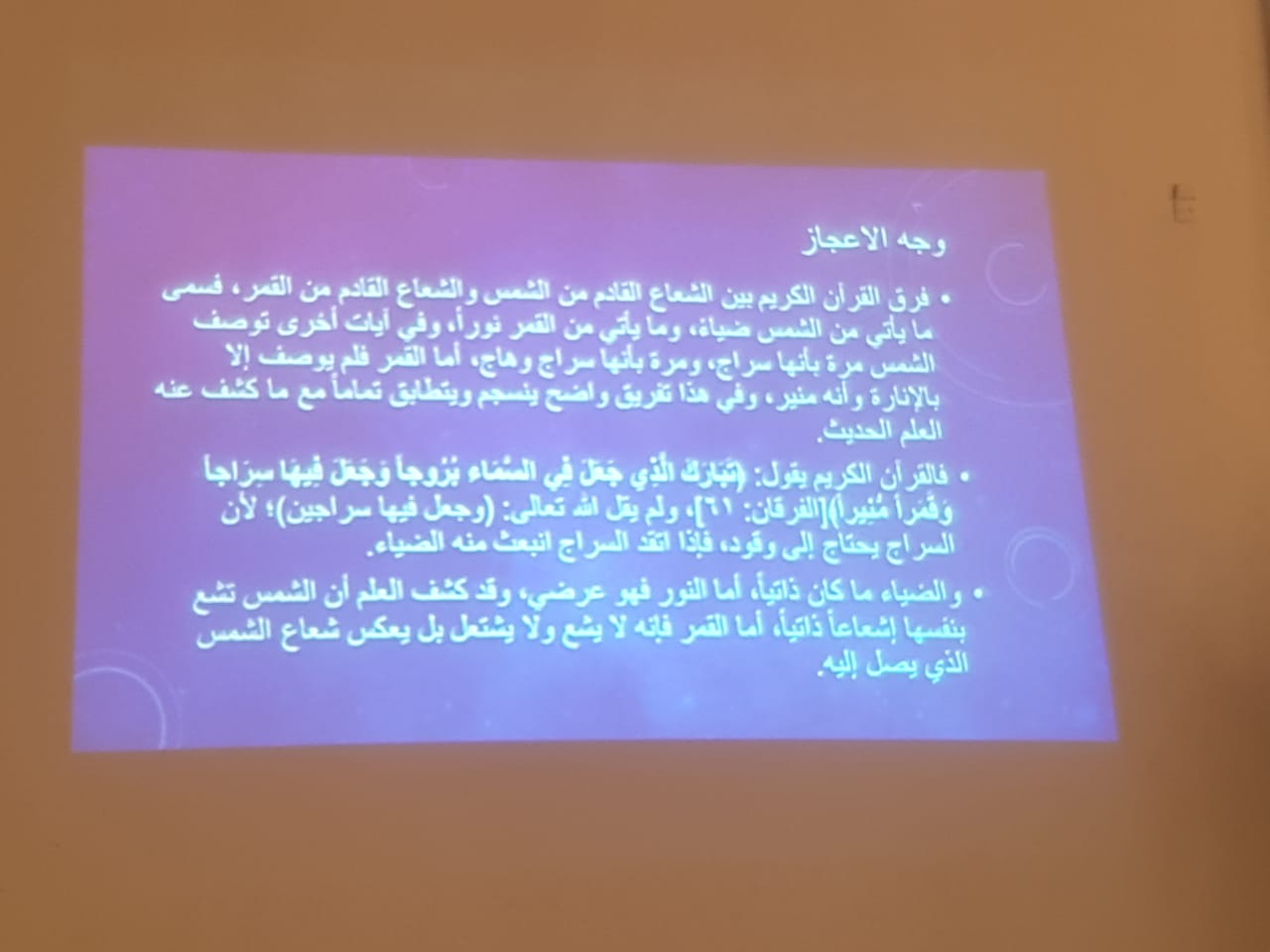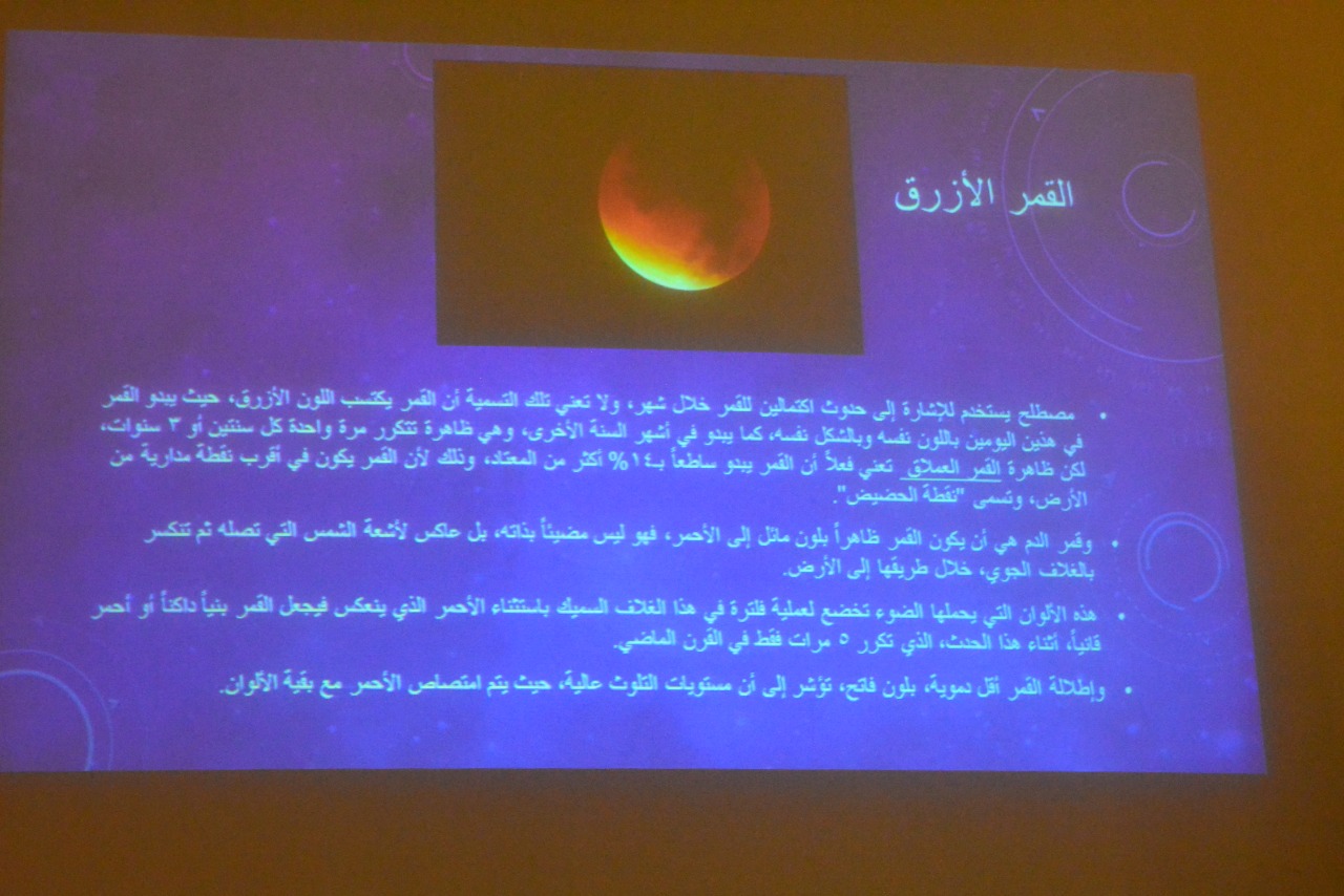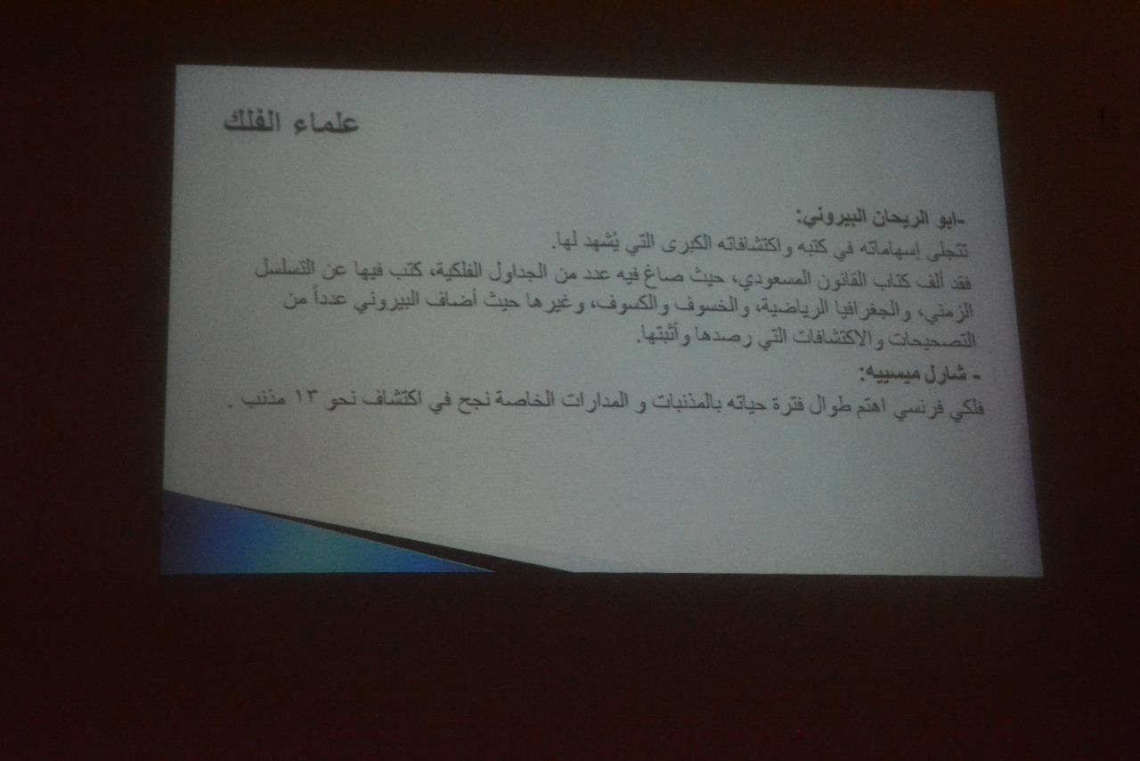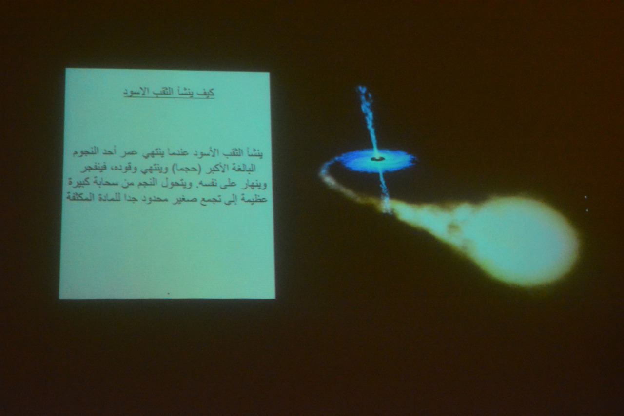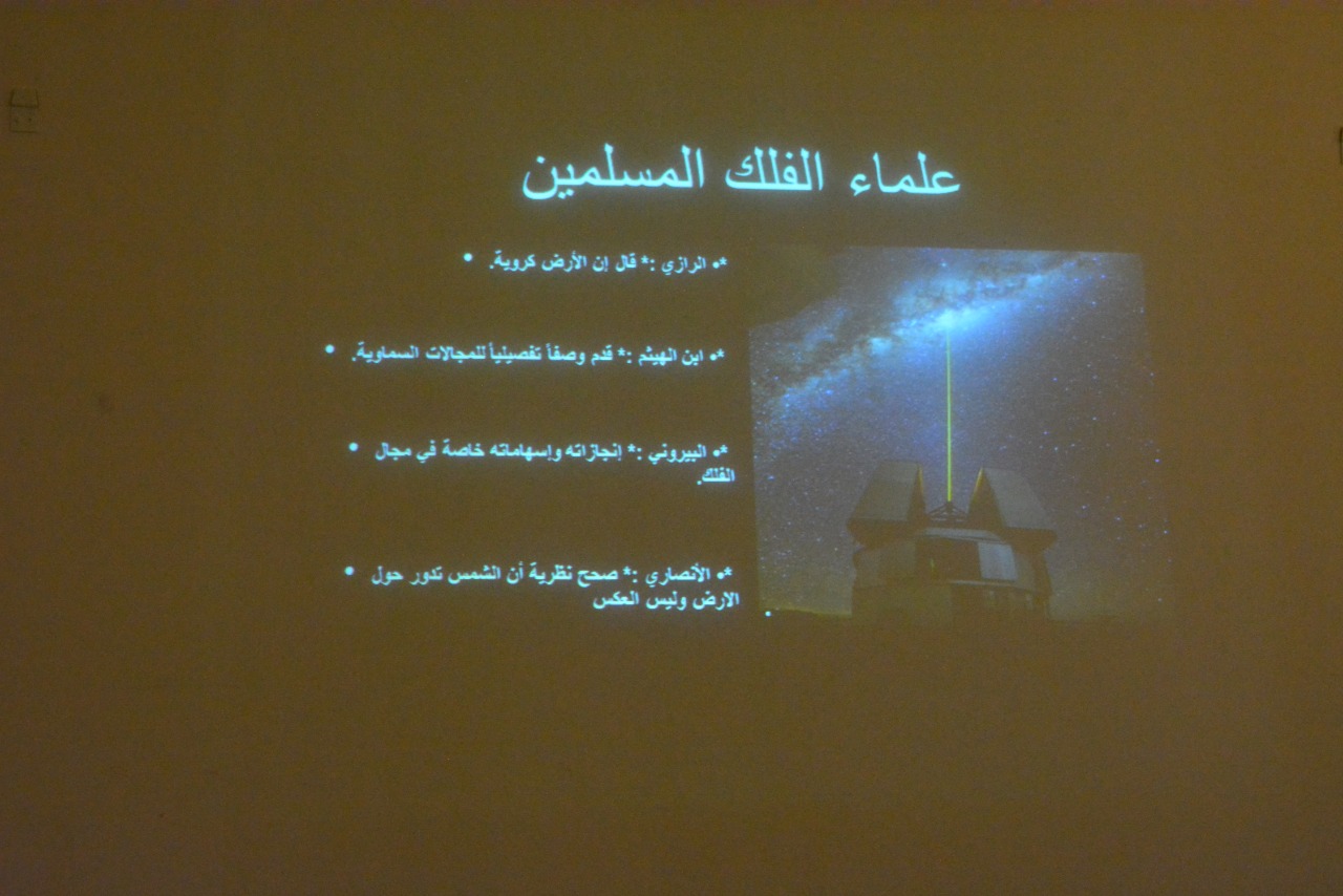 نظم نادي العلوم الأساسية عمادة السنة التحضيرية –شطر الطالبات يوم الخميس الموافق 1440/6/2هـ فعالية بعنوان: (علم الفلك) بحضور عدد من منسوبات العمادة وطالبات المجموعة السابعة المسار الصحي تحت إشراف الأستاذة (رجاء عبد الفتاح) . وقد تضمنت فعاليات الندوة قيام طالبات نادي العلوم الأساسية بعمل عرض توضيحي شمل التعريف بعلم الفلك,والفيزياء الفلكية,وذكر علماء الفلك المسلمين ,كما تحدثو عن الثقب الأسود وكيف ينشأ ومنشأ جاذبيته القوية واعجازالقرآن الكريم ( مجال الفلك) . كما تضمنت الندوة توزيع بروشوراتٍ ومطوياتٍ على الحضور تحتوي على تعريف السنة الضوئية كوحدة للمسافات البعيدة تستخدم بعلم الفلك ,وتعريف الزمكان أحد مصطلحات علم الفلك. واختتم اللقاء بكلمة من الأستاذة رجاء عبد الفتاح شكرت فيها الحضور لتكرمهن بالحضور وتحفيزهن الطالبات ووجهت كلمة تشجيعية للطالبات المشاركات فى تنظيم الفعالية وشكرتهن على مجهودهن اللافت.