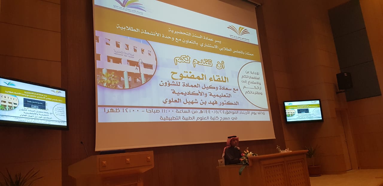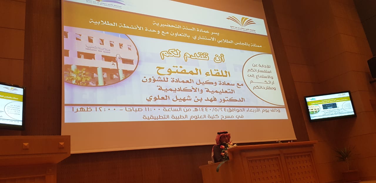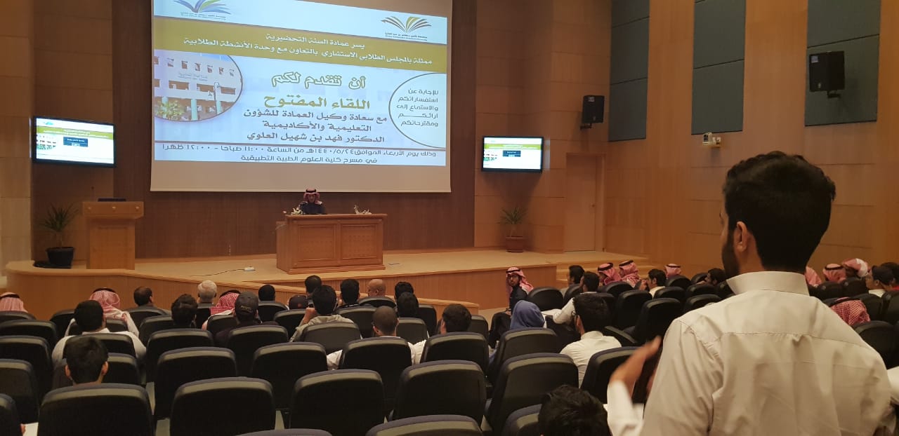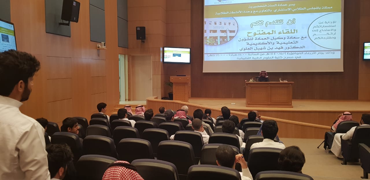 أقامت عمادة السنة التحضيرية ممثلة بالمجلس الاستشاري الطلابي وبالتعاون مع وكالة الشؤون التعليمية والأكاديمية في العمادة لقاءً مفتوحا مع سعادة وكيل العمادة للشؤون التعليمية والأكاديمية الدكتور فهد بن شهيل العلوي اليوم الأربعاء :24/5/1440هـ في مسرح كلية العلوم الطبية التطبيقية ، وبحضور كل من سعادة وكيل العمادة للشؤون الفنية والتطوير والجودة الدكتور محمد بن عبده محزري وسعادة رؤساء الأقسام ورئيس وحدة الأرشاد الأكاديمي بالعمادة، بهدف التوجيه والإرشاد والاستماع لأهم القضايا التي تعني الطلاب.