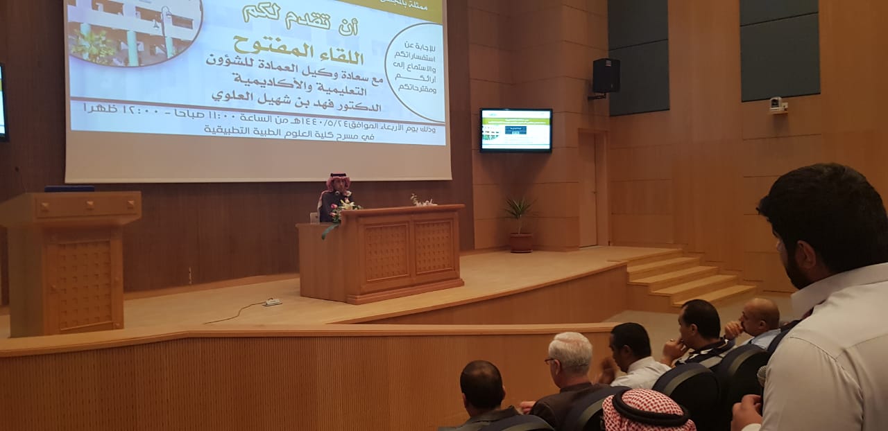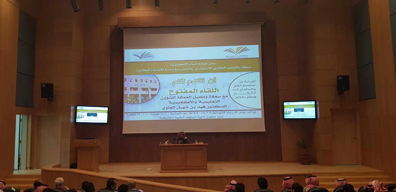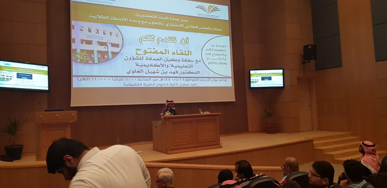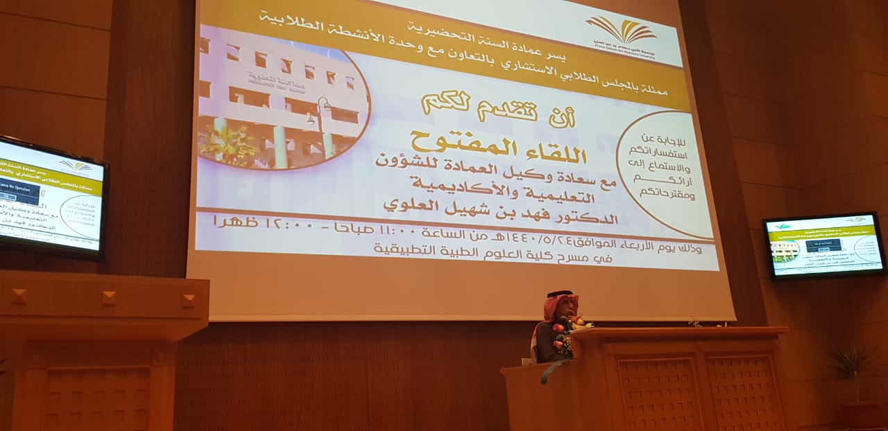 أقامت عمادة السنة التحضيرية ممثلة بالمجلس الاستشاري الطلابي وبالتعاون مع وكالة الشؤون التعليمية والأكاديمية في العمادة لقاءً مفتوحا مع سعادة وكيل العمادة للشؤون التعليمية والأكاديمية الدكتور فهد بن شهيل العلوي اليوم الأربعاء :24/5/1440هـ في مسرح كلية العلوم الطبية التطبيقية ، وبحضور كل من سعادة وكيل العمادة للشؤون الفنية والتطوير والجودة الدكتور محمد بن عبده محزري وسعادة رؤساء الأقسام ورئيس وحدة الأرشاد الأكاديمي بالعمادة، بهدف التوجيه والإرشاد والاستماع لأهم القضايا التي تعني الطلاب.