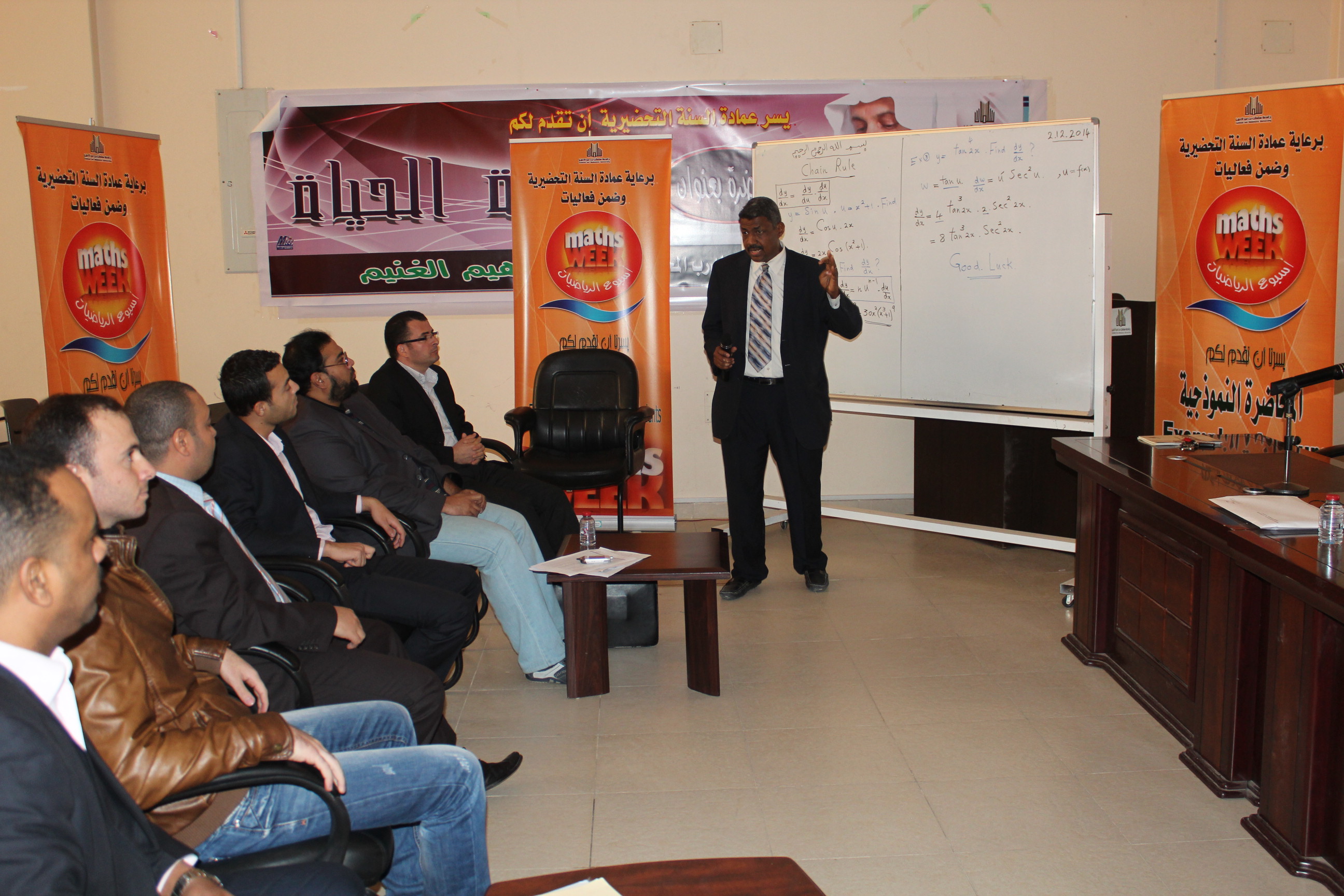 وفي نهاية هذا البرنامج تم تقديم ورشة عمل لمدرسي مقررات الرياضيات تحت عنوان ( المحاضرة النموذجية ) قام بتقديمها د. محمد الغزالي موجهة لأعضاء هيئة التدريس في قسم الرياضيات و الإحصاء و حيث أشار إلى أن العملية التدريسية فن من الفنون و حث على أن يبدع كل في إيصال معلوماته باستخدام كافة الوسائل المتاحة , و ضرورة إشاعة روح التشجيع و التحفيز, و الأهمية الكبرى لتقويم الطلاب من خلال تمرين يكشف مدي تحقيق أهداف الدرس و شهدت المحاضرة تفاعلا كبيرا من أعضاء هيئة التدريس.