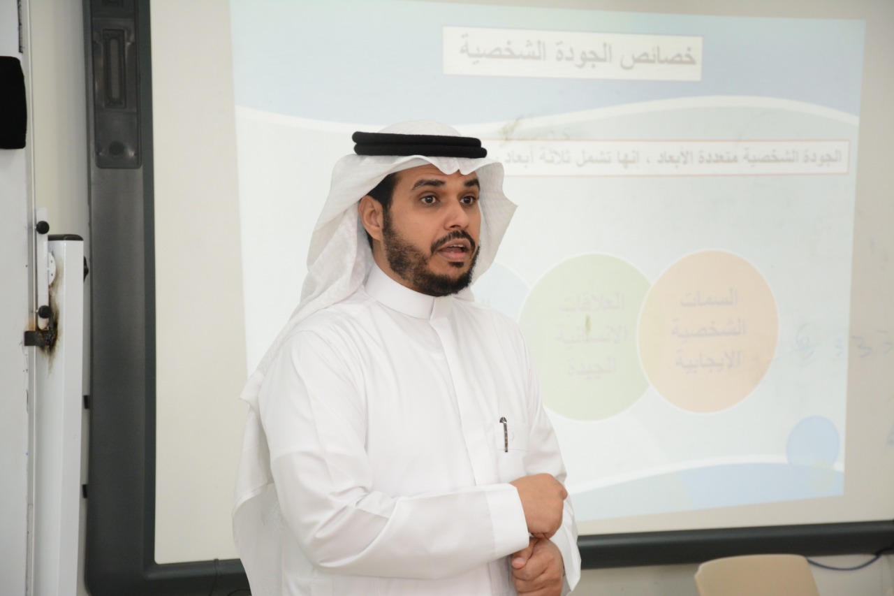 نظمت عمادة السنة التحضيرية بالتعاون مع وحدة الوعي الفكري الطلابي بعمادة شؤون الطلاب اليوم الأربعاء 16 / 3 / 1441هـ دورة تدريبية بعنوان : " جودة حياتك " قدمها د. خالد السهلي ، وقد تطرق الدكتور في دورته مجموعة من المحاور أهمها : مفهوم الجودة الشخصية ، وأهمية الجوة ، وماهي سمات الشخصية الإيجابية وذكر منها الصدق في العلاقات ، واحترام الآخرين ، والتركيز على الإيجابيات وغض الطرف عن السلبيات ، كما تحدث عن خطوات تعزيز الجودة الشخصية ، وركائزها ، ثم فُتح باب النقاش والمحاورة حول الموضوع ، وتقديم بعض النماذج الواقعية.