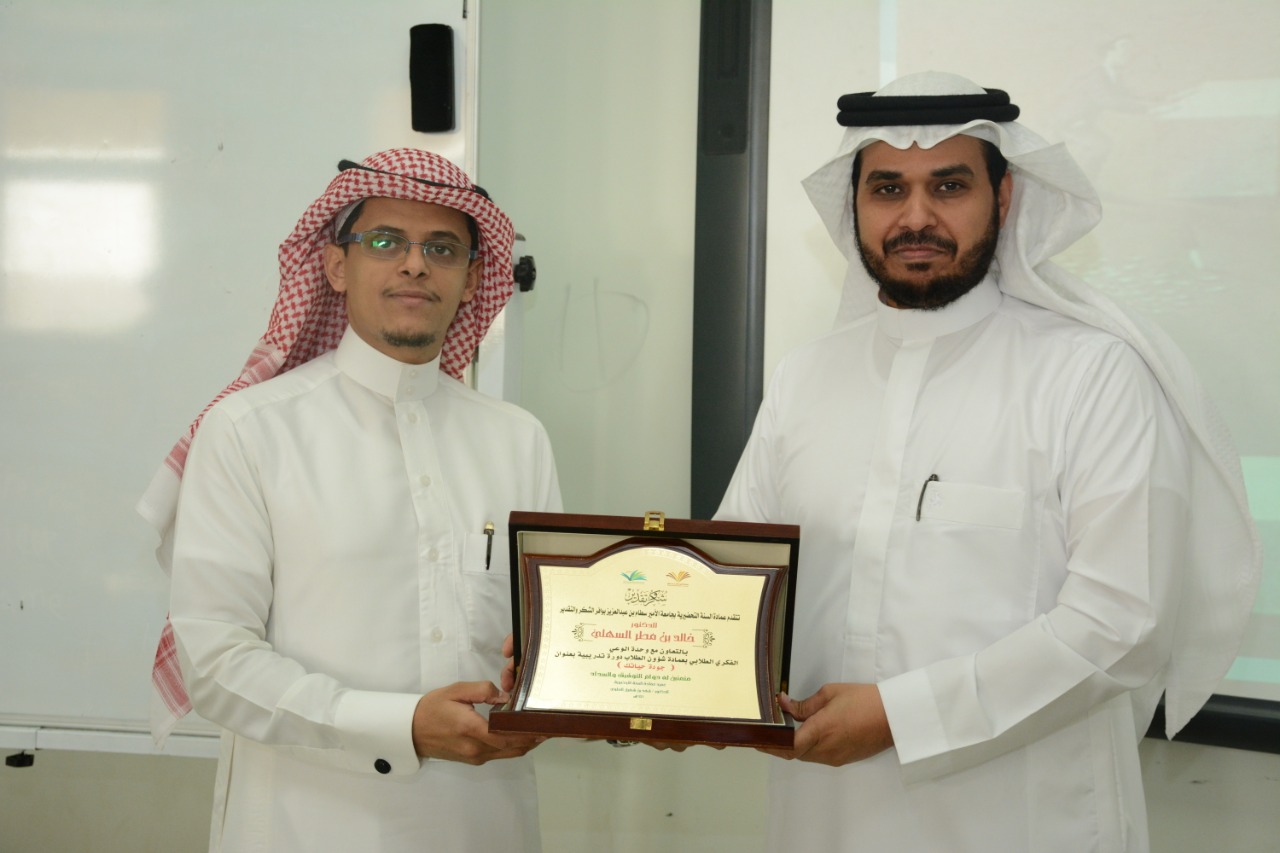 وفي الختام قام وكيل عمادة السنة التحضيرية للشؤون التعليمية والأكاديمية المكلف الدكتور محمد بن عبده محزري بتقديم درع تذكري للدكتور خالد السهلي نظير جهوده المبذولة وتقديمه للدورة التدريبية.