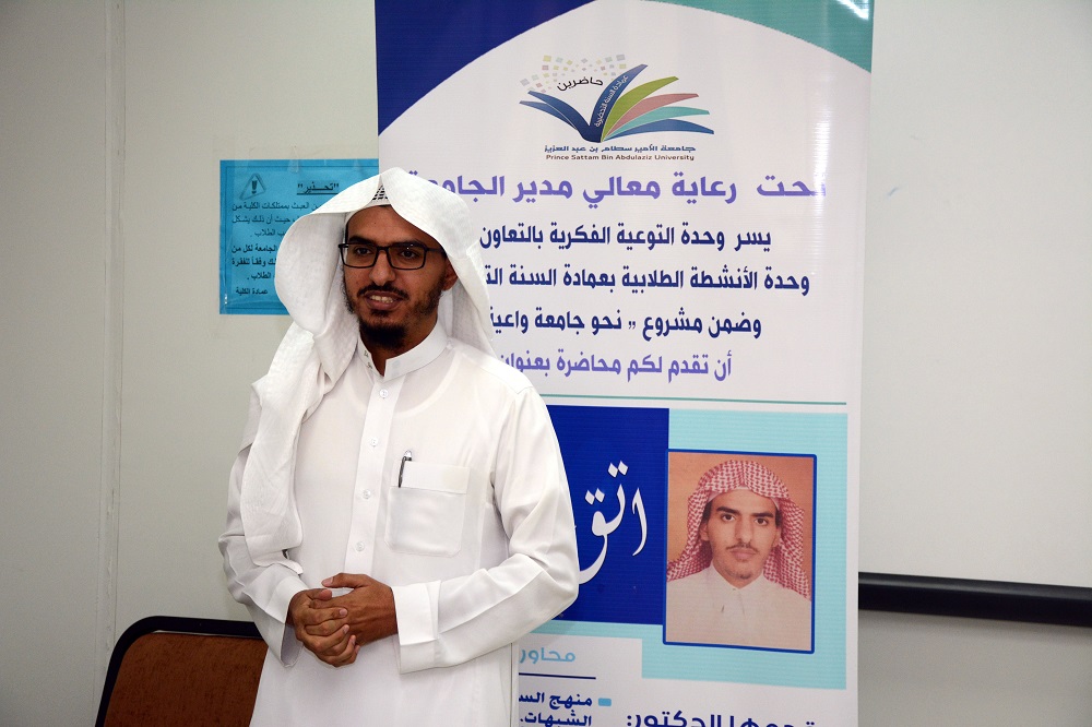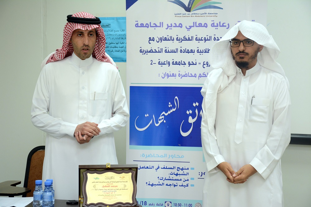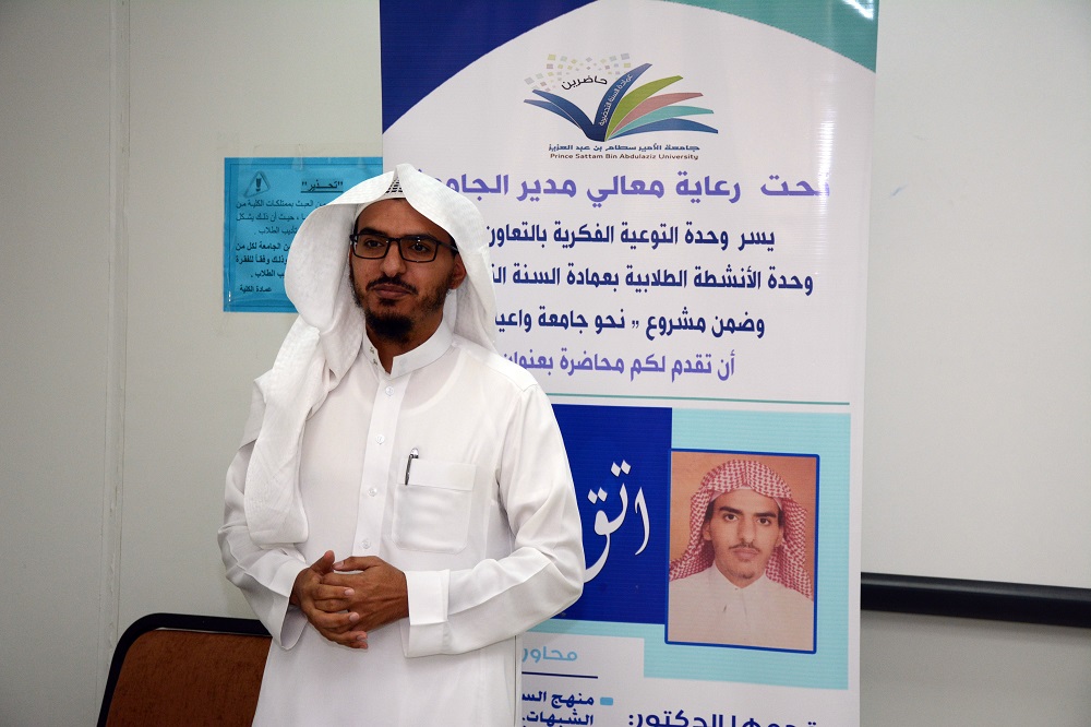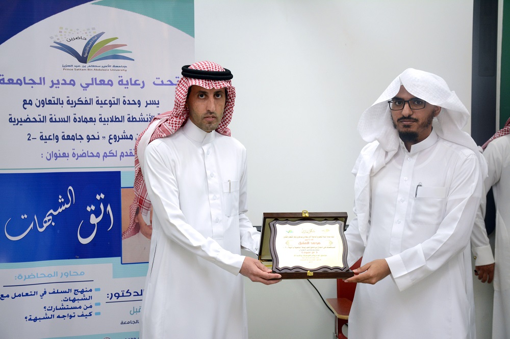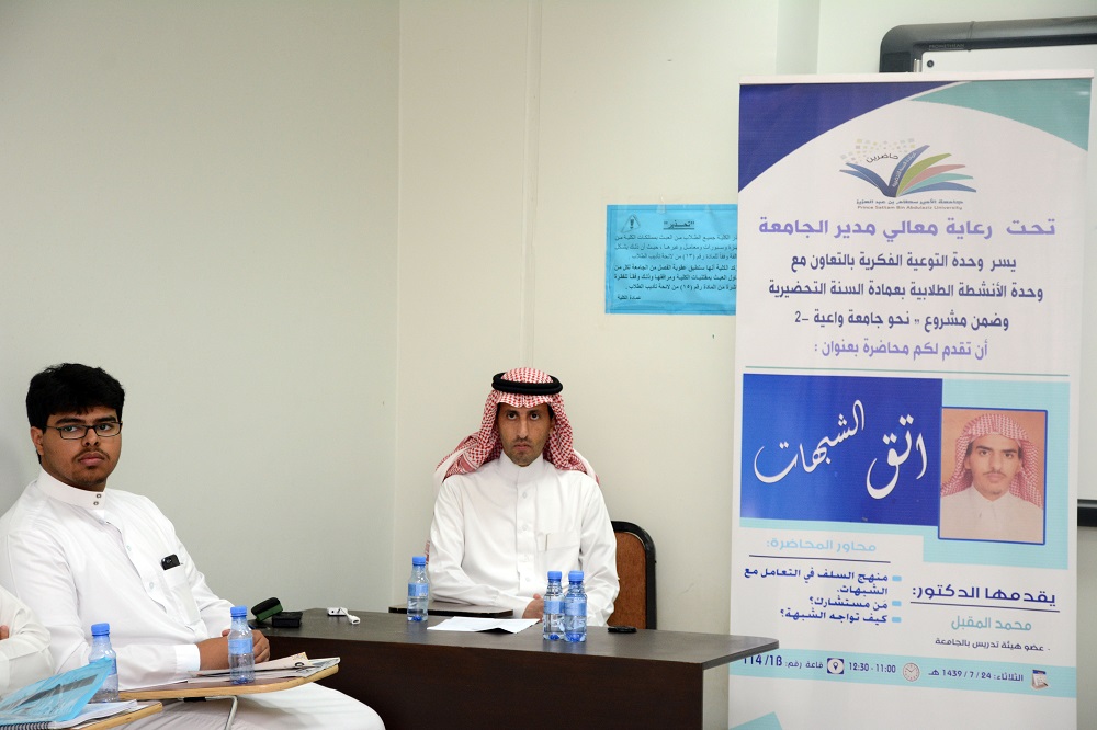 أقيمت محاضرة بعمادة السنة التحضيرية تحت عنوان (اتق الشبهات) وذلك يوم الثلاثاء: 24 / 07/ 1439هـ قدمها الدكتور محمد المقبل عضو هيئة التدريس بالجامعة، وتأتي هذه الفعالية ضمن فعاليات (مشروع نحو جامعة واعية2 ) الذي تنظمه وحدة التوعية الفكرية بالجامعة.
