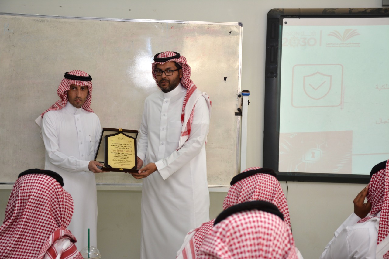 وفي الختام قام وكيل عمادة السنة التحضيرية للشؤون التعليمية والأكاديمية الدكتور فهد بن شهيل العلوي بتقديم درع تذكاري للدكتور عادل بصيّص نظير جهوده المبذولة لإنجاح فعاليات برنامج تخصصك.