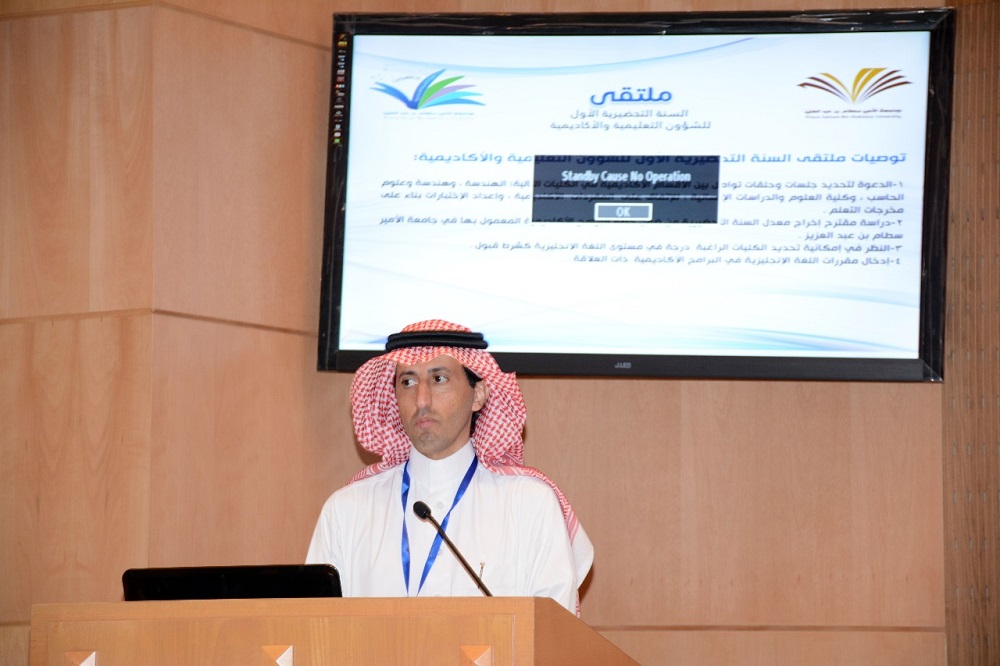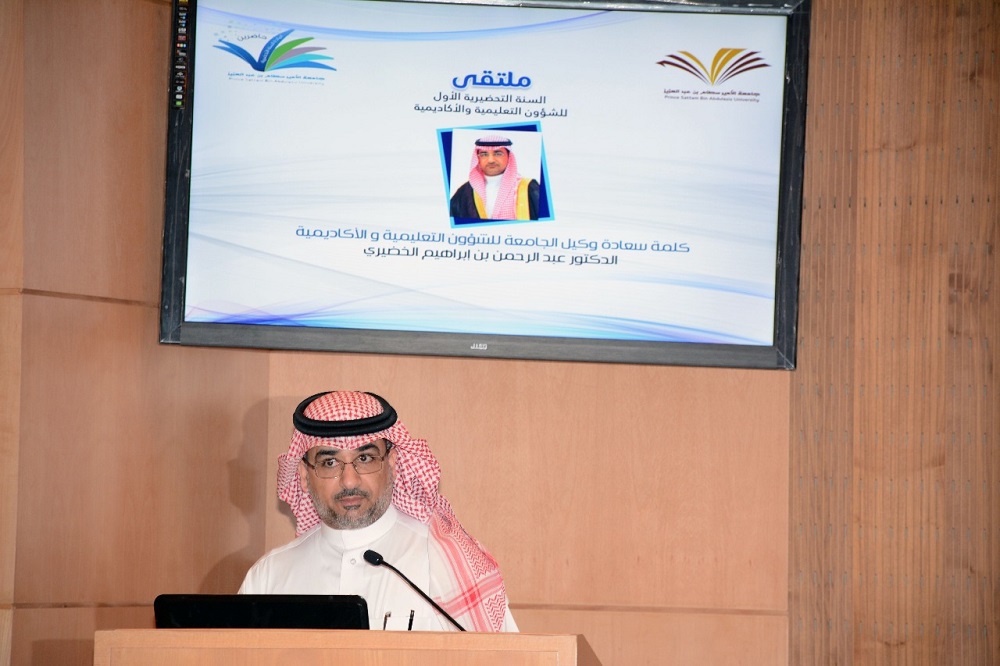 ثم تفضل سعادة وكيل الجامعة للشؤون التعليمية والأكاديمية الدكتور الخضيري بكلمة أعرب بها عن سعادته بهذا الملتقى الإيجابي لما سيقدمه من تعريف الكليات بالمفردات التعليمية التي تقدمها العمادة لأبنائها الطلاب ، ومراجعة الخطط الدراسية لما يتوافق مع رؤية المملكة 2030 ، كما دعا الكليات لمعرفة ما تقدمه عمادة السنة التحضيرية، ومحاولة تبادل الأفكار الإيجابية التي تصب في مصلحة العملية التعليمية.