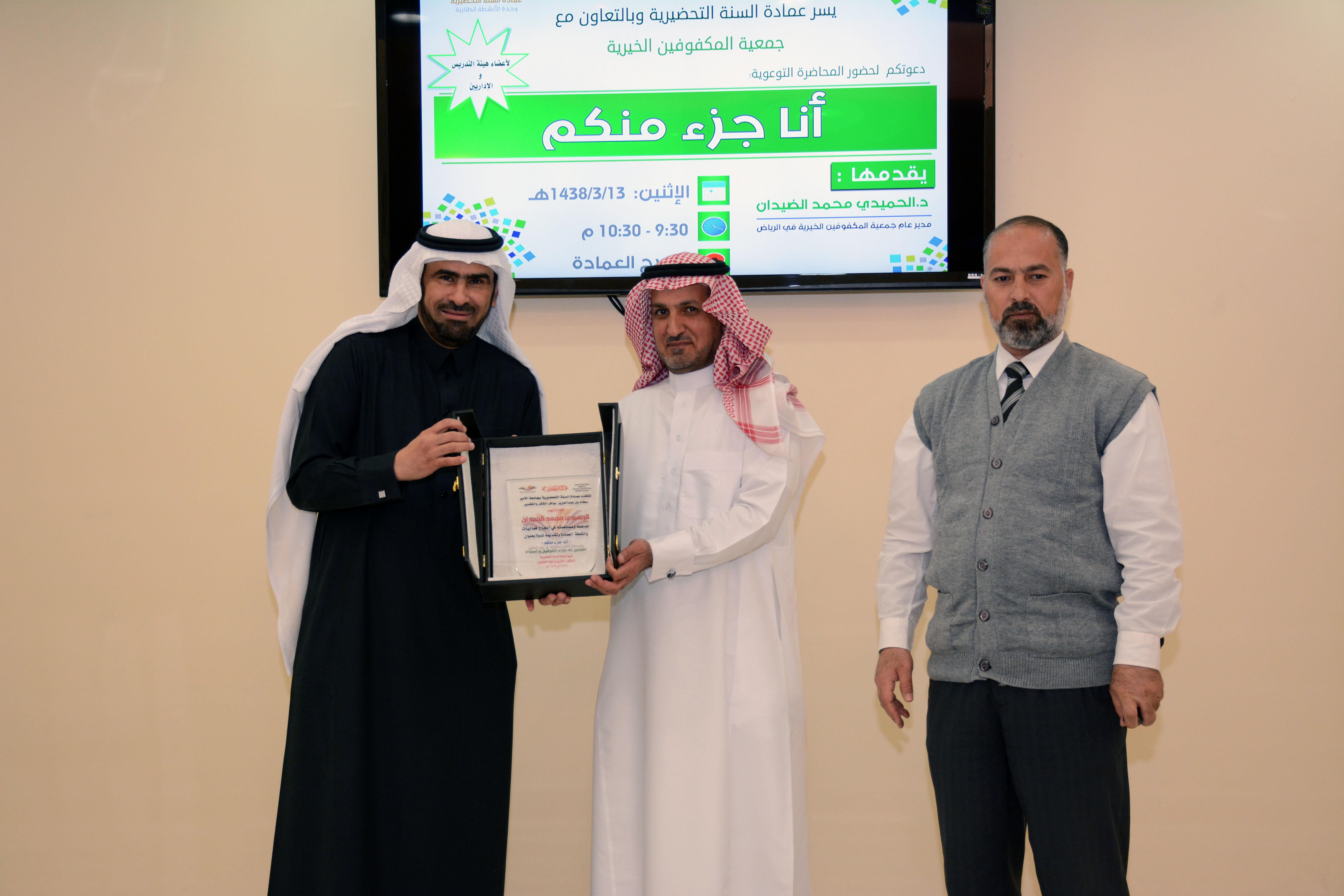أقامت عمادة السنة التحضيرية ندوة بعنوان (أنا جزء منكم ) وبالتعاون مع جمعية المكفوفين الخيرية في الرياض؛ وذلك ضمن اهتمامات العمادة في تقديم البرامج التوعوية والعناية بذوي الاحتياجات الخاصة .
