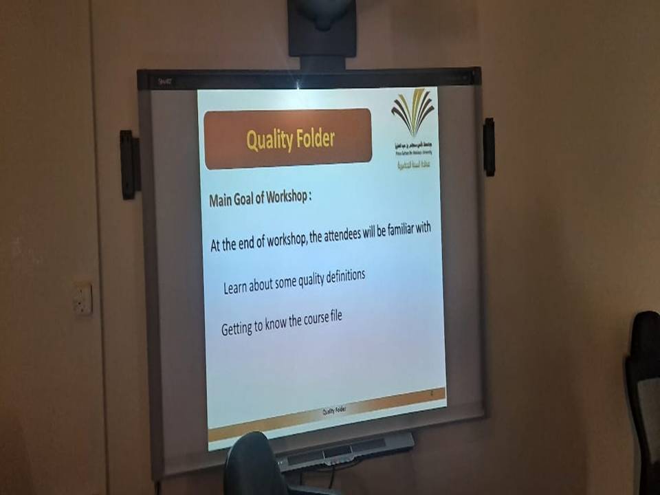 تحت رعاية وكيلة عمادة السنة التحضيرية د.أمل بنت صالح الشمراني وضمن برامج تهيئة أعضاء هيئة التدريس الجدد اقامت عماده السنة التحضيرية ورشة عمل تدريبية يوم الاثنين الموافق 1444/2/23هـ،بعنوان "جودة المقررات " من تقديم الدكتورة زينب الماحي حيث تناولت الورشة عدد من المحاور اهمها : توضيح مفهوم الجودة التعليمية وشرح أهم متطلبات جودة المقررمن توصيف المقرر و تقرير المقرر ومخرجات التعلم وكما تم توضيح كيفية تكوين ملف للمقرر وانتهت الورشة بالشكر لكل من يسعى لتطوير العملية التعليمية والتي من شأنها ضمان جودة التعليم والتعلم بالجامعة وذلك ضمن برامج التطوير المهني للأعضاء.