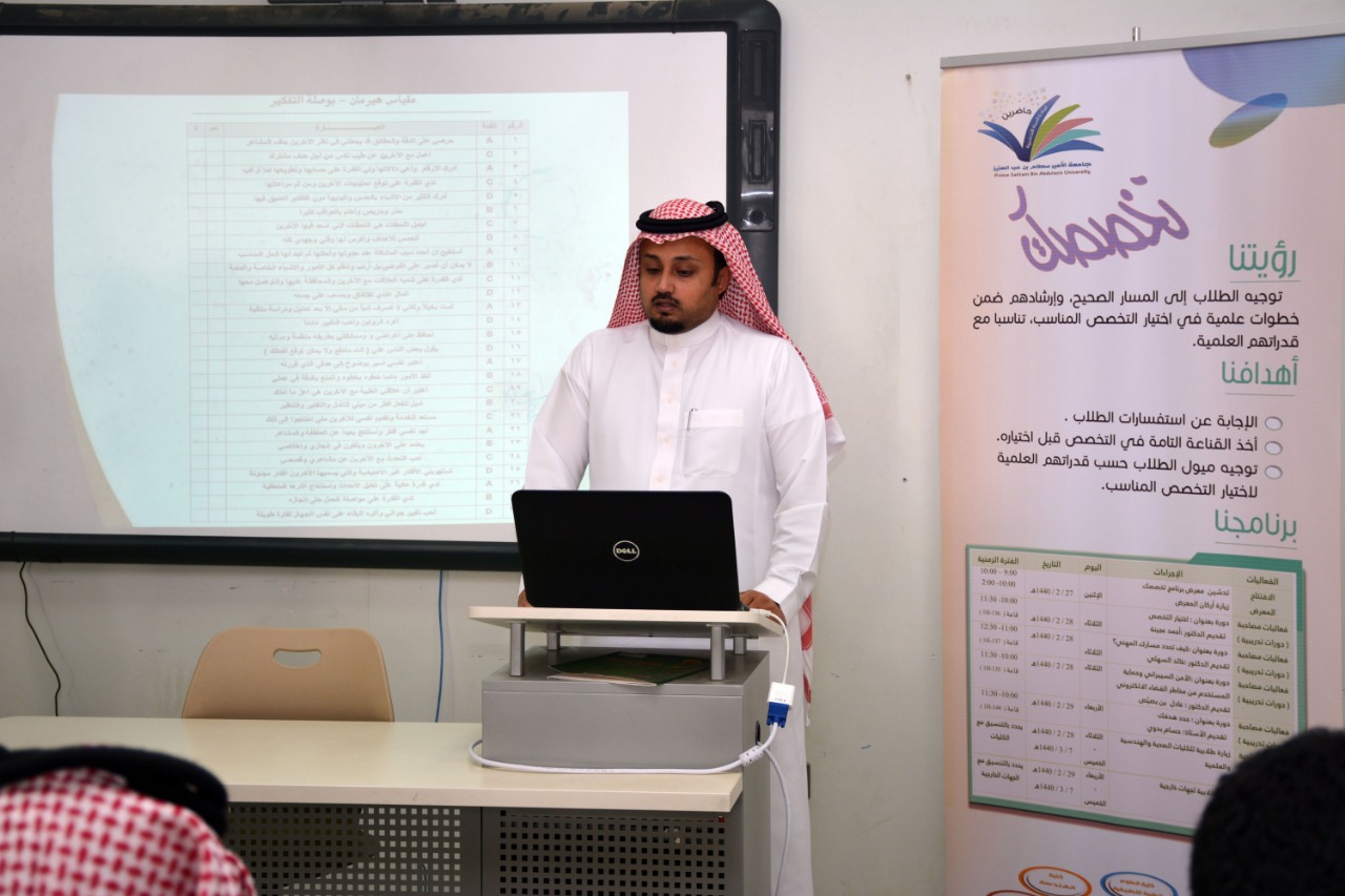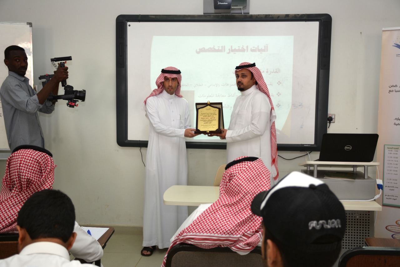 وتناولت الورشة عدة محاور منها أهمية اختيار التخصص الجامعي ، كما تناولت الورشة واقع اختيار الطلاب للتخصص الجامعي. ثم تعرّض سعادته لمثلث اختيار التخصص الجامعي . عقب ذلك تناول أنواع الاختبارات التي يمكن للطالب الاستفادة منها في تحديد التخصص الذي يناسب ميوله وقدراته. وقبل فتح باب الحوار واستقبال أسئلة الطلاب حث الدكتور أحمد عجينة الطلاب على اختيار التخصص الذي يناسب قدراتهم وميولهم مما سيكون له أثر كبير في تميزهم وإبداعهم. وفي الختام قام وكيل عمادة السنة التحضيرية للشؤون التعليمية والأكاديمية الدكتور فهد بن شهيل العلوي بتقديم درع تذكاري لسعادة عميد كلية ادارة الأعمال نظير جهوده المبذولة لإنجاح فعاليات برنامج تخصصك.