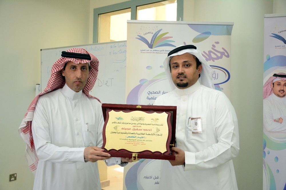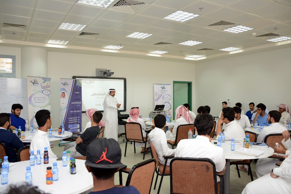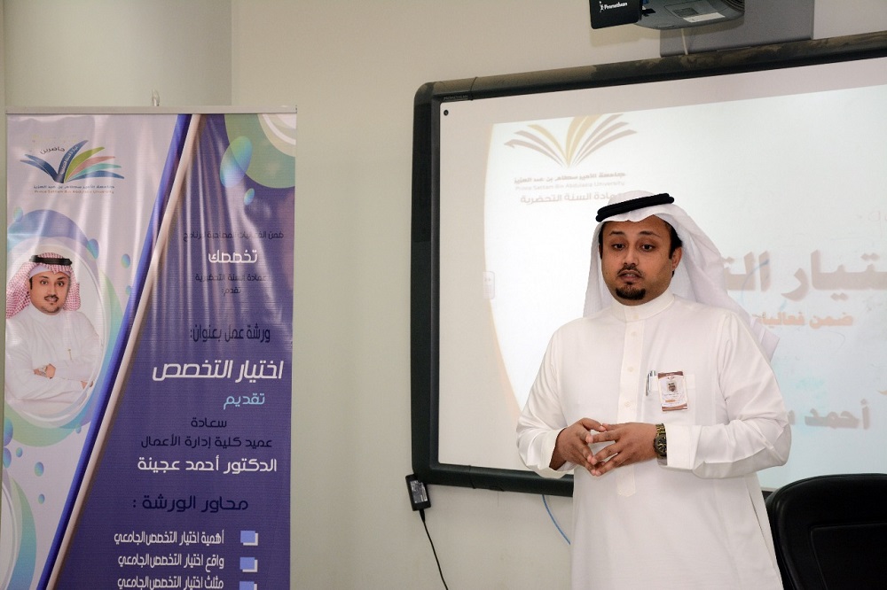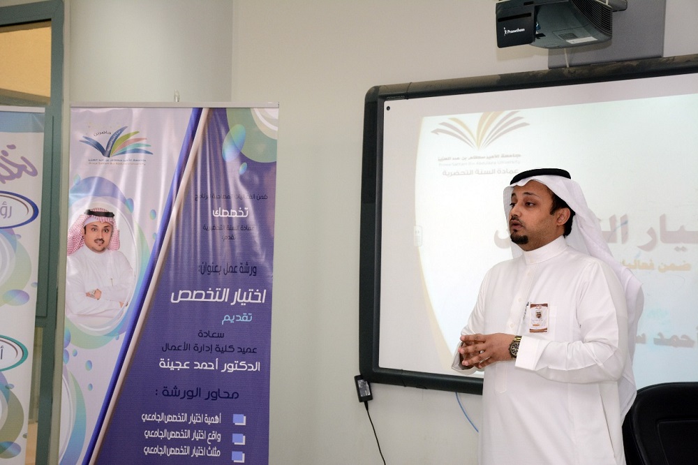 وقد شهدت الورشة تفاعلا كبيرا من الطلاب الذين أثروا الورشة بمداخلاتهم ومشاركاتهم . حيث تناولت الورشة عدة محاور منها أهمية اختيار التخصص الجامعي ، كما تناولت الورشة واقع اختيار الطلاب للتخصص الجامعي. ثم تعرّض سعادته لمثلث اختيار التخصص الجامعي . عقب ذلك تناول أنواع الاختبارات التي يمكن للطالب الاستفادة منها في تحديد التخصص الذي يناسب ميوله وقدراته. وقبل فتح باب الحوار واستقبال أسئلة الطلاب حث الدكتور أحمد عجينة الطلاب على اختيار التخصص الذي يناسب قدراتهم وميولهم مما سيكون له أثر كبير في تميزهم وإبداعهم. وفي الختام قام وكيل عمادة السنة التحضيرية للشؤون التعليمية والأكاديمية الدكتور فهد بن شهيل العلوي بتقديم درع تذكري لسعادة عميد كلية ادارة الأعمال نظير جهوده المبذولة لإنجاح فعاليات برنامج تخصصك.