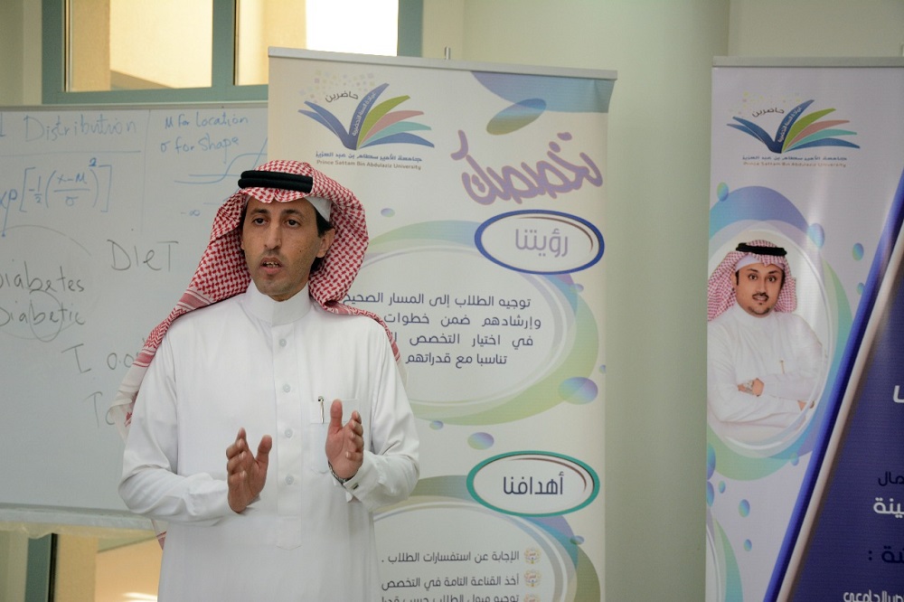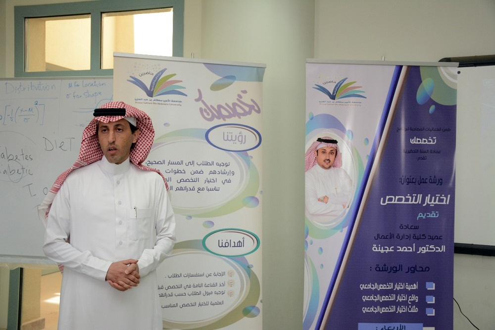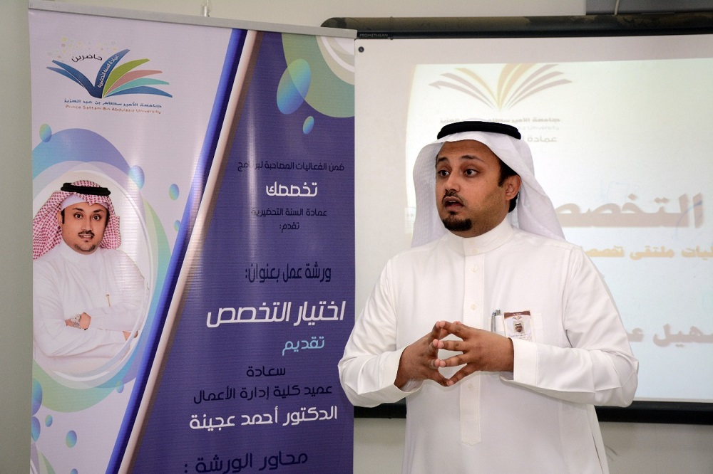 على هامش برنامج تخصصك، والذي تقيمه عمادة السنة التحضيرية بهدف نشر ثقافة اختيار التخصص الذي يناسب ميول وقدرات الطلاب. وضمن الفعاليات المصاحبة للبرنامج، أُقيمت ورشة عمل للطلاب بعنوان:" اختيار التخصص " قدَمها سعادة عميد كلية ادارة الأعمال الدكتور أحمد عجينة وذلك يوم الأربعاء :11 /7 /1439هـ .