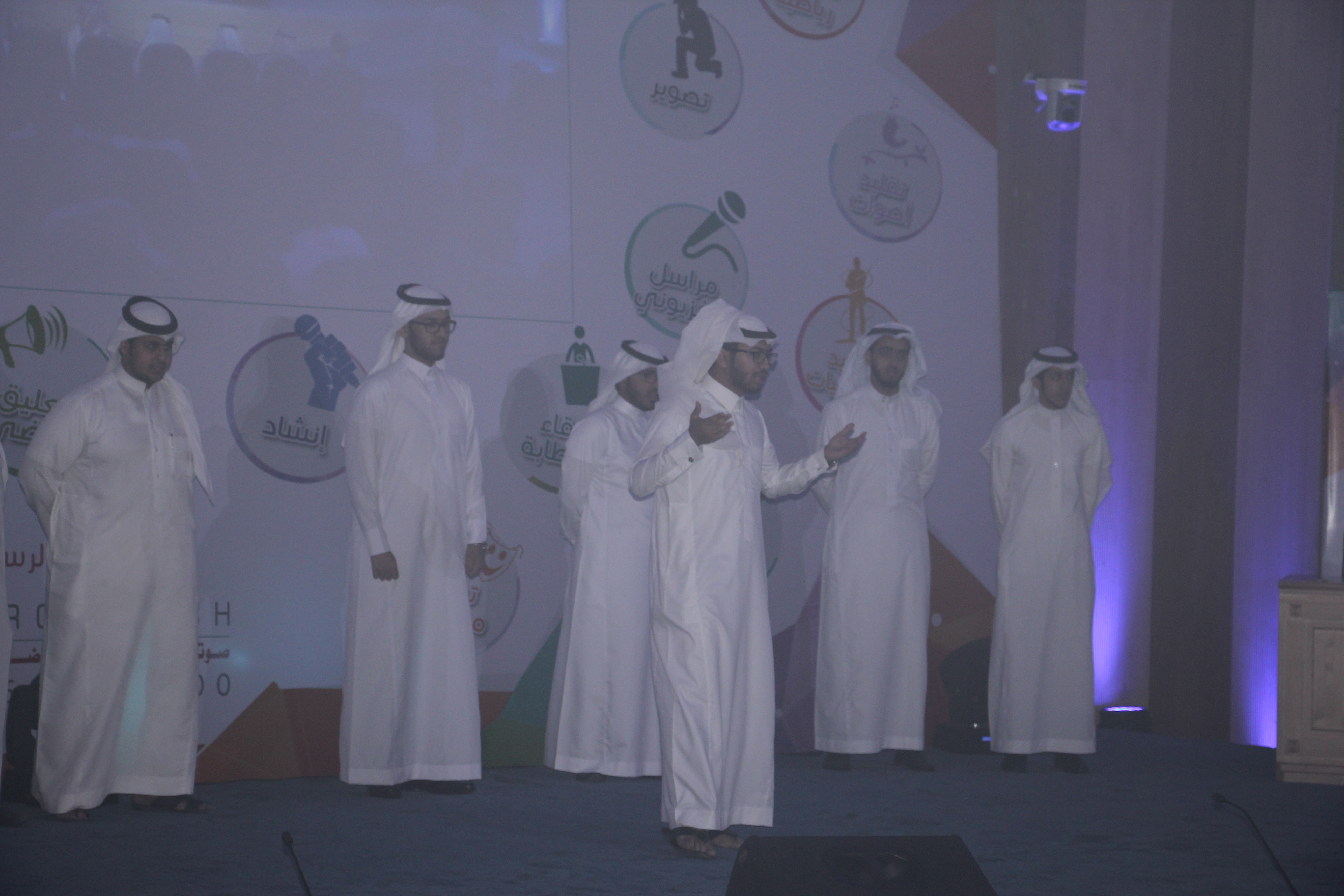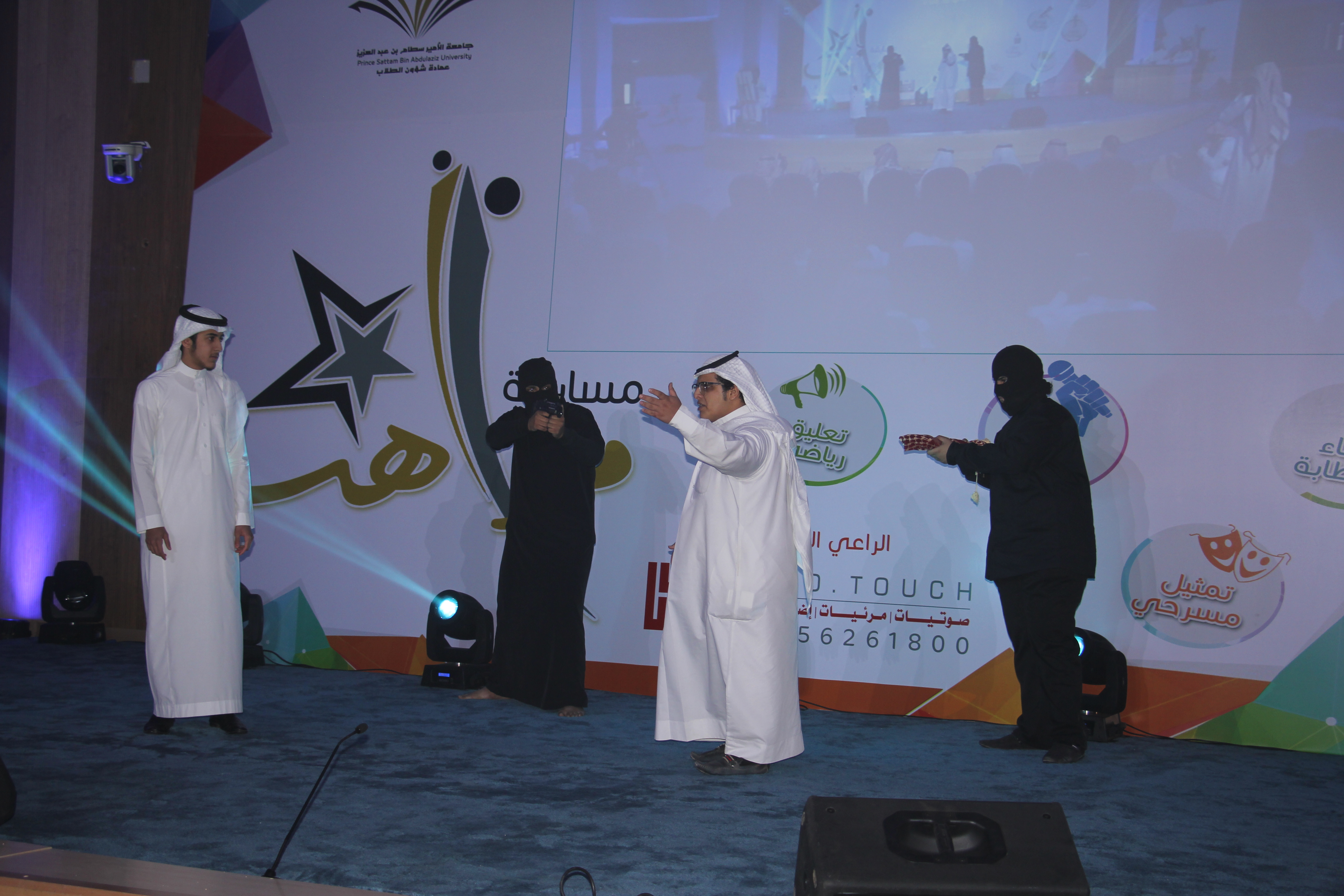 ومن ثم قدم مشهد تمثيلي يحمل ذات العنوان، تبعه أوبريت إنشادي جمع عدد من المنشدين والملقين، وخلال تلك العروض كان أحد الطلاب ممن يمتلك موهبة الرسم يرسم صورة لخادم الحرمين الملك سلمان بن عبدالعزيز، وعرض كذلك في مقطع مصور إبداع آخر لأحد طلاب العمادة رسمة وعبارة للعنوان المذكور سابقا، وختمت المشاركة بفقرة تقيلد الأصوات، وتم بعد ذلك تقديم الصورة هدية تذكارية لعميد شؤون الطلاب الدكتور مسفر الكبيري.