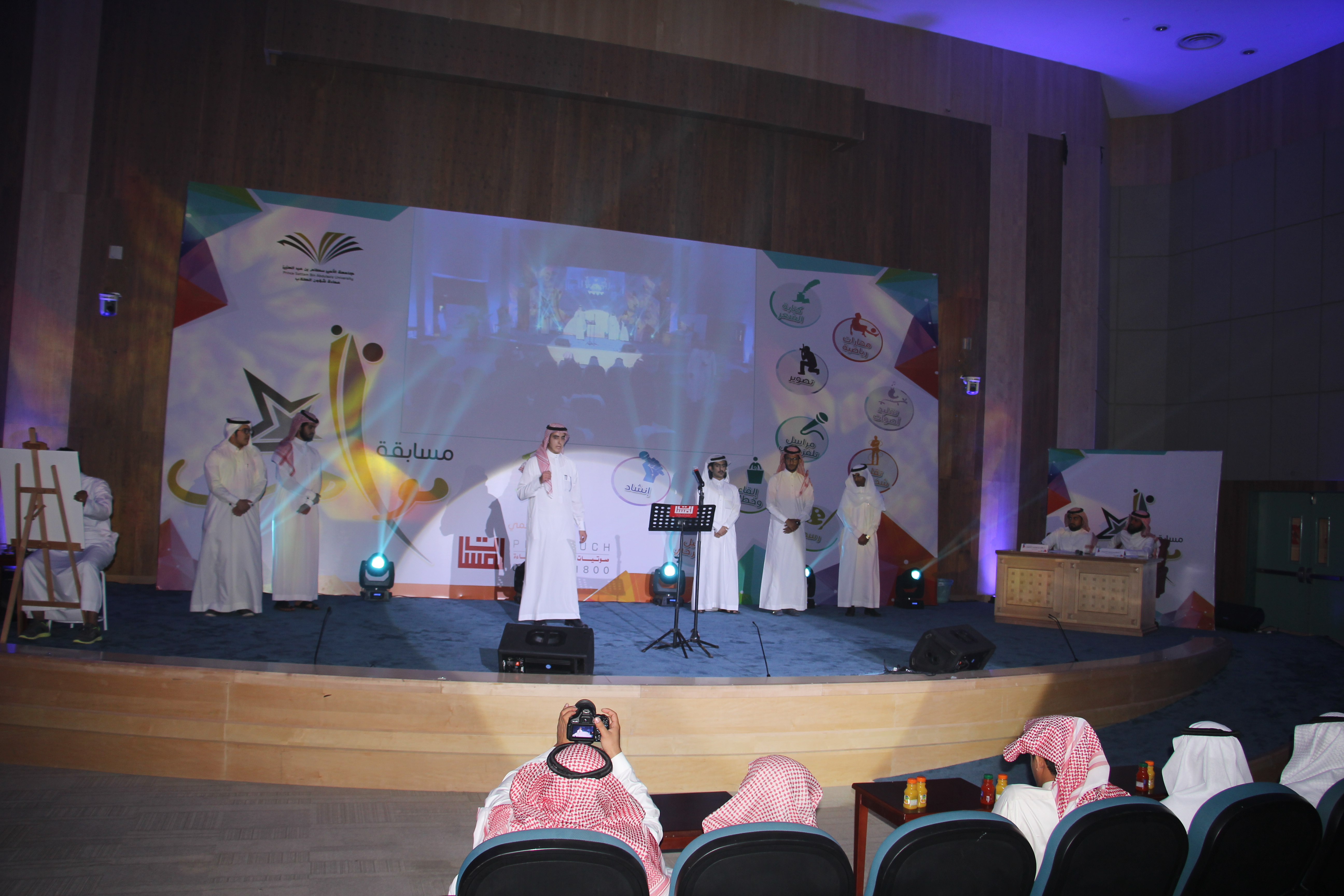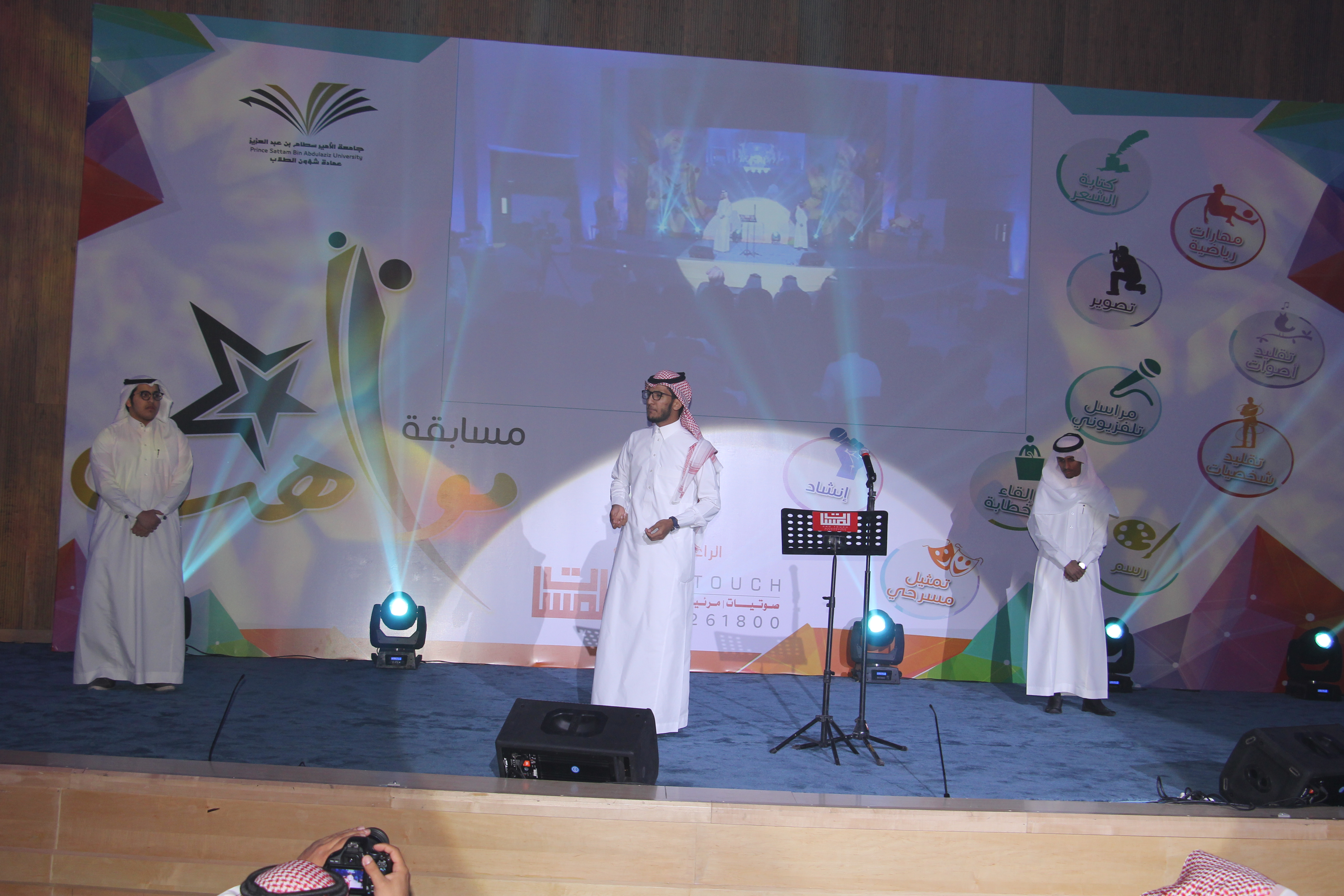 برعاية عميد عمادة شؤون الطلاب سعادة الدكتور مسفر بن محماس الكبيري انطلقت مسابقة مواهب التي تنظمها إدارة الأندية الطلابية بعمادة شؤون الطلاب بجامعة الأمير سطام بن عبدالعزيز، وأولى مشاركة كانت من طلاب عمادة السنة التحضيرية، حيث تمثلت المشاركة في تقديم لوحات فنية متنوعة بعنوان (نفتخر بك يا وطن)، بدأت بقراءة آيات من القرآن الكريم، وبعد ذلك عرض مجموعة من الطلاب بعض الخواطر والقصائد والمشاعر تجاه هذا الوطن المعطاء، وتنوعت فيه الأداءات بتنوع المشاركات.