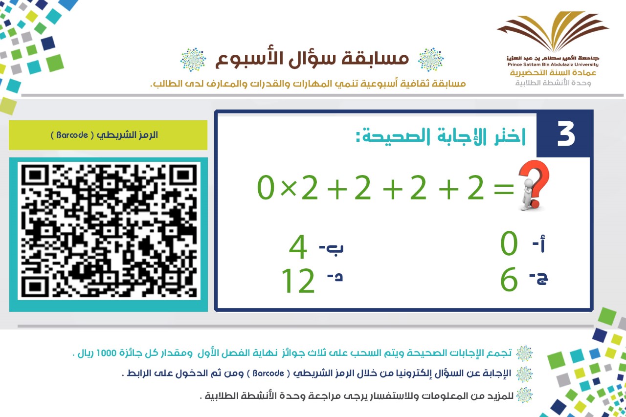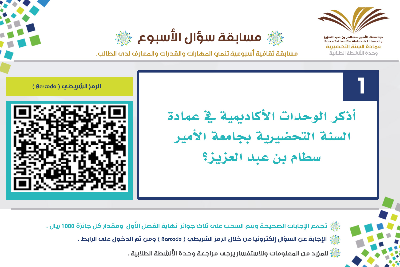 انطلاقا من حرص عمادة السنة التحضيرية وتفعيلا لدور وحدة الأنشطة الطلابية لرفع المستوى الثقافي لدى الطلاب، ولتنمية المهارات والقدرات والمعارف لديهم، وتتكون من سؤول كل أسبوع، وتجمع الإجابات الصحيحة ويتم السحب على ثلاث جوائز نهاية الفصل الأول ومقدار كل جائزة 1000 ريال، وتستقبل الإجابات إلكترونيا عبر الرابط المرفق والذي سوف يتم تحديثه أسبوعيا.