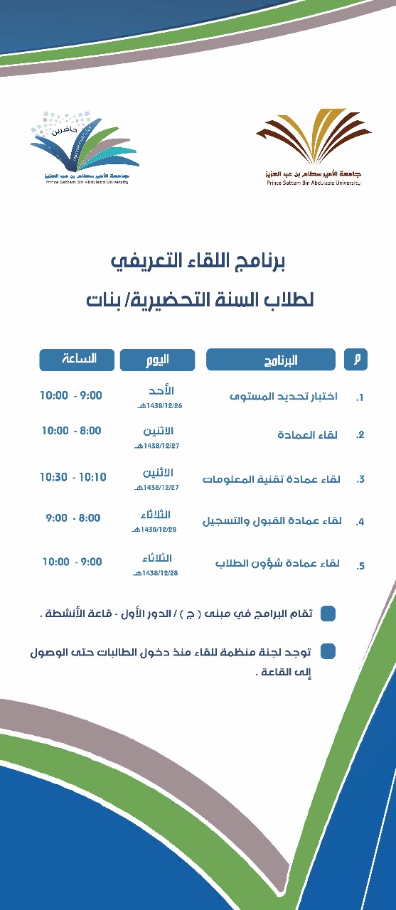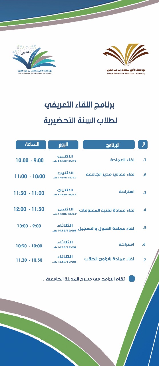 تنظم عمادة السنة التحضيرية اللقاء التعريفي لطلابها وطالباتها المستجدين وذلك خلال الفترة 27 - 29 / 12 /1438هـ بمسرح إدارة الجامعة بمبنى رقم 6 بالمدينة الجامعية للطلاب , أما للطالبات فسيقام بإذن الله بمبنى السنة التحضيرية للطالبات الجديد.