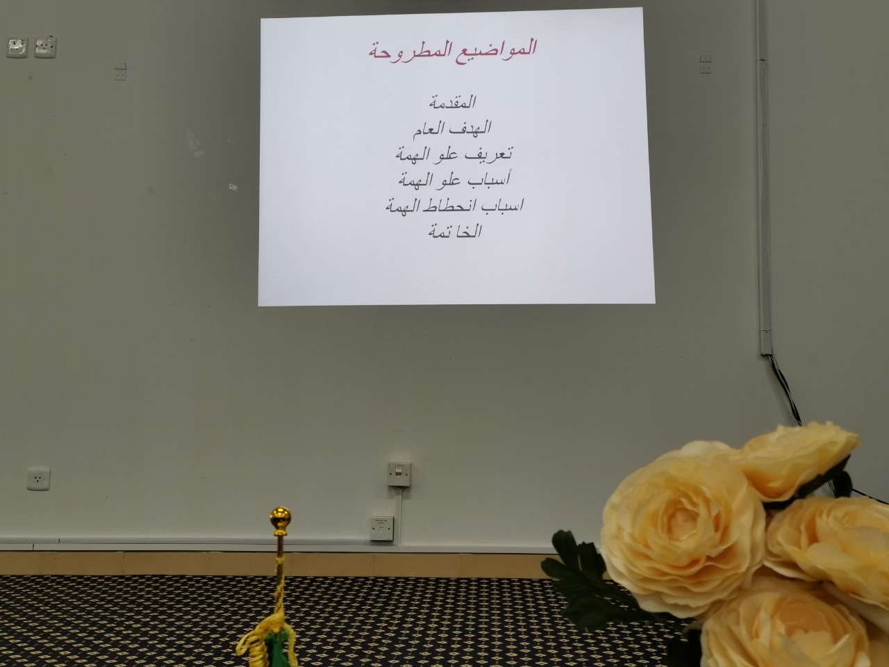 إن من سجايا الإسلام التحلي بعلو الهمة حيث فالهمة تكون في ميدان العلم والعمل. ومن هنا استضافت طالبات نادي عون التطوعي بعمادة السنة التحضيرية الأستاذة أمل سعيدان لتقديم برنامج بعنوان( بالهمة كل شي يزهو ) يوم الخميس1441/7/3هـ،في مسرح العمادة كان يهدف إلى اكساب الطالبات مهارات العلو بالهمة لكونها فضيلة وسلام وسلم للرقي والكمال باذن الله حيث تضمن البرنامج تعريف علو الهمة وأسبابها وأسباب انحطاط الهمة حيث كان هناك إقبال من الطالبات ومنسوبات العمادة في طرح الاسئلة والتفاعل مع الموضوع.