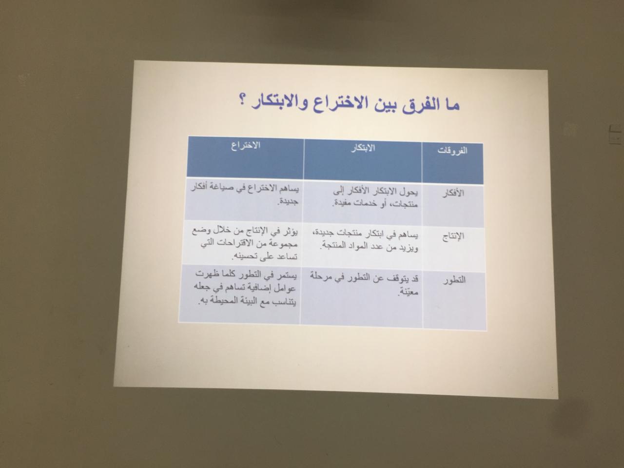 منبع الابتكارات تبدأ بفكرة لذلك أقامت عمادة السنة التحضرية ضمن محور الابتكارات للملتقى العلمي الطلابي- قسم الطالبات دورة تدريبية بعنوان (كونى مبدعة )قدمتها دكتورة حنان فراج و ذلك يوم الأربعاء الموافق 1441/6/25هـ حيث تضمنت الدورة عرض تقديمي يستعرض عدة محاور منها (ما هو الابتكار؟و الفرق بين الاختراع والابتكار، أمثلة عن المبدعين والمبتكرين "صفات المبتكرين"، الابتكار نتاج الاختراع، معايير الحصول على براءة الإختراع، ما هي الملكية الفكرية ؟ و الجهات المسئولة عن تطبيق أنظمة حماية الملكية الفكرية، ماهي الجهات التي تقدم دعم للمخترعين) كما تم عرض عدد من الابتكارات المهمة في العالم ولأهمية الابتكارات تم تداول عدة نقاشات تثري و تحفز الطالبات لابتكار أفكار جديدة و متميزة. و قد حضر عدد كبير من طالبات العمادة .