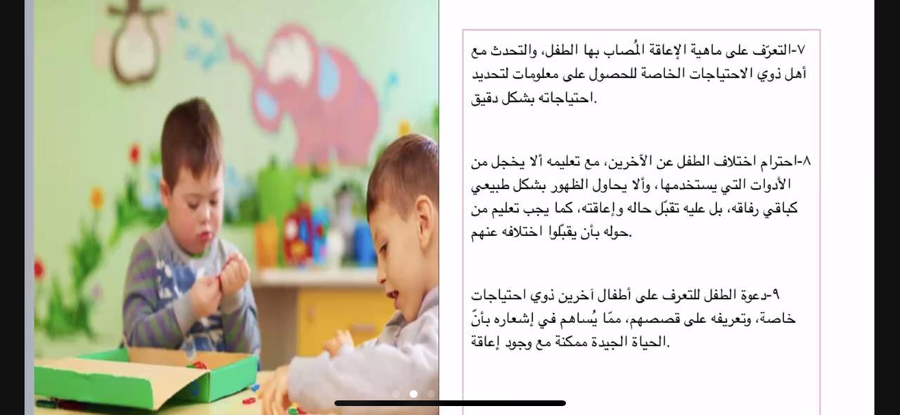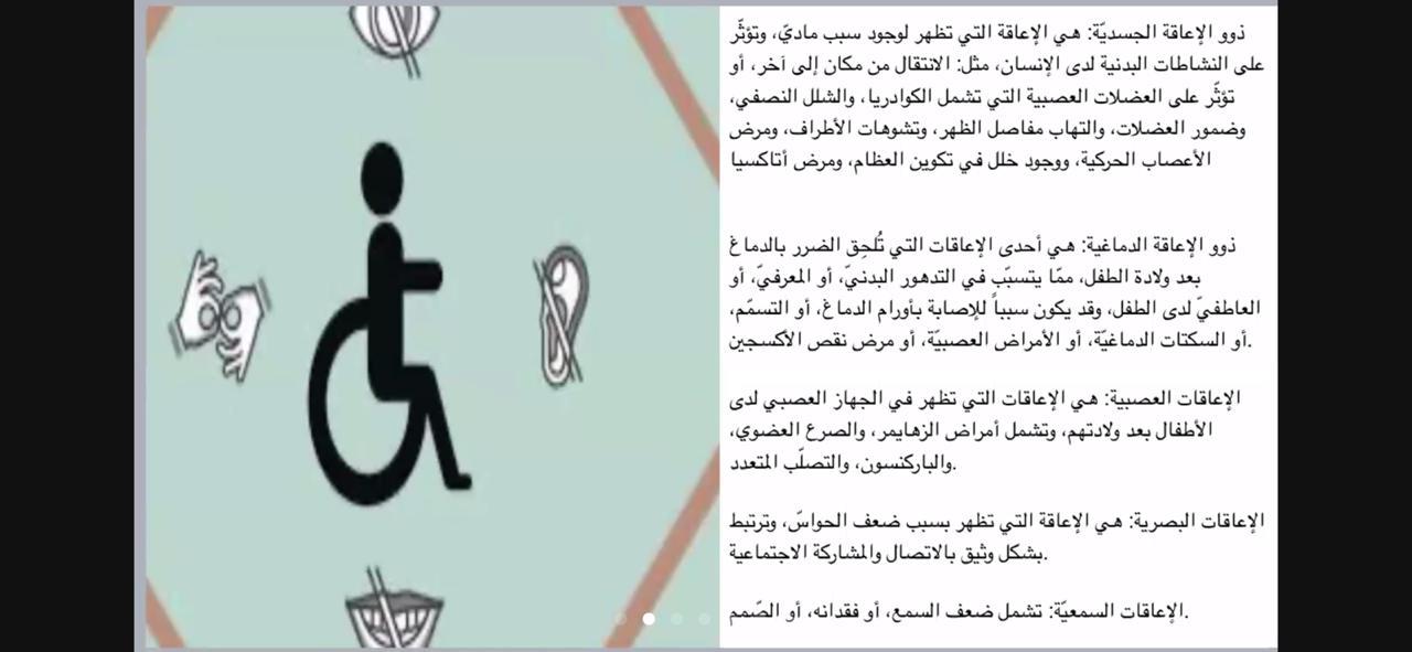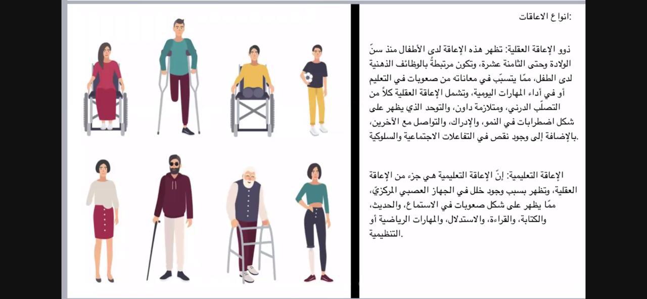 يحيط بنا أشخاص يعانون دائماً من اعتلالات أو اختلافات عضوية ومحدودية في النشاط مما يمنعهم من المشاركة الكاملة والفاعلة في المجتمع ولذلك نظمت طالبات نادي العلوم الأساسية بعمادة السنة التحضيرية - قسم الطالبات يوم الثلاثاء الموافق1442/2/12هـ فعالية بعنوان " فن التعامل مع ذوي الإعاقة" تحت إشراف الأستاذة إقبال أحمد، استُعرض فيه تعريف الإعاقة و أنواعها مثل الإعاقات العقلية والتعليمية والجسدية والدماغية والعصبية وكيفية التعامل معها، و استُعرض أيضاً فن التعامل مع الصغار والكبار والمراهقين منهم وكيفية رسم الابتسامة على وجوههم وتجنب إحراجهم ، وتم عرض فيديو يوضح كيفية دمج هذه الفئة في المجتمع وإبراز طاقاتهم وما لديهم من مواهب مدفونة تحتاج إلى اكتشافها وتنميتها وصقلها مما فيه من مصلحة للوطن.