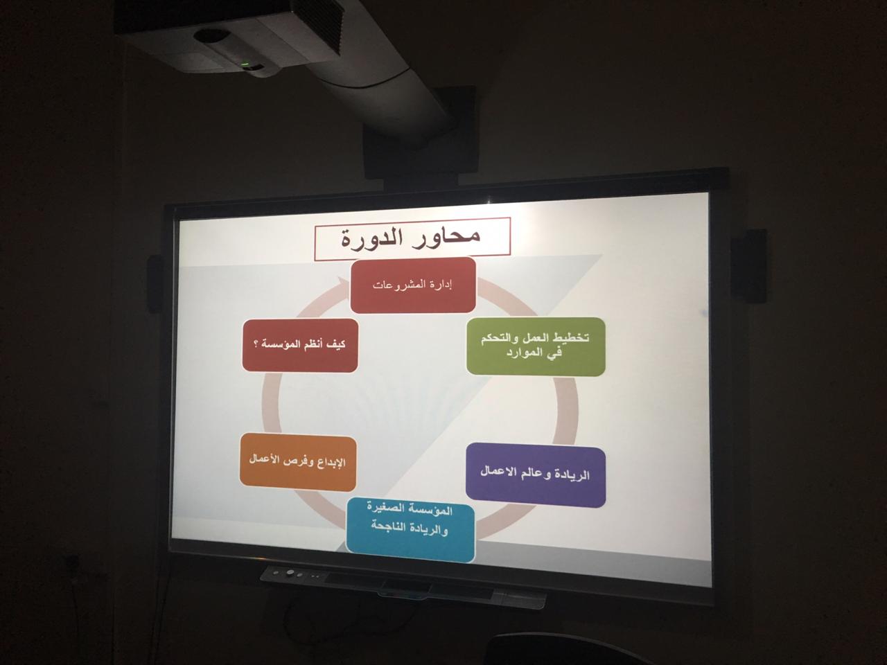 إكمالاً لمسيرتنا الحالية المفعمة بالحزم والمليئة بالعزم على النجاح بعمادة السنة التحضيرية وضمن فعاليات الملتقى العلمي الثالث,أقيمت دورة تدريبية بعنوان إدارة المشايع الصغيرة من تقديم الاستاذة حنان الحربي وذلك يوم الأحد الموافق 1440/5/14هـ في قاعة التدريب والتخطيط , حيث بدأت الدورة التدريبية بعرض تقديمي يشتمل على عدة محاور وهي: إدارة المشروعات, تخطيط العمل والتحكم في الموارد, الريادة في عالم الاعمال, المؤسسة الصغيرة والريادة الناجحة, الإبداع وفرص الأعمال, كيف أنظم المؤسسة؟ خطة عمل المؤسسة, دراسة الجدوى, ومن ثم تم أستعراض عدد من المشاريع الناجحة في عالم الأعمال, والتطرق لأهدافها وبعض الخطط التنفيذية لها وتنوع طرق التسويق الناجحة للمشاريع, ومن خلال ذلك تم تبادل الأسئلة والاستفسارات من قبل الطالبات التي تسهم بالفائدة لمشاركاتهن في محور ريادة الأعمال.