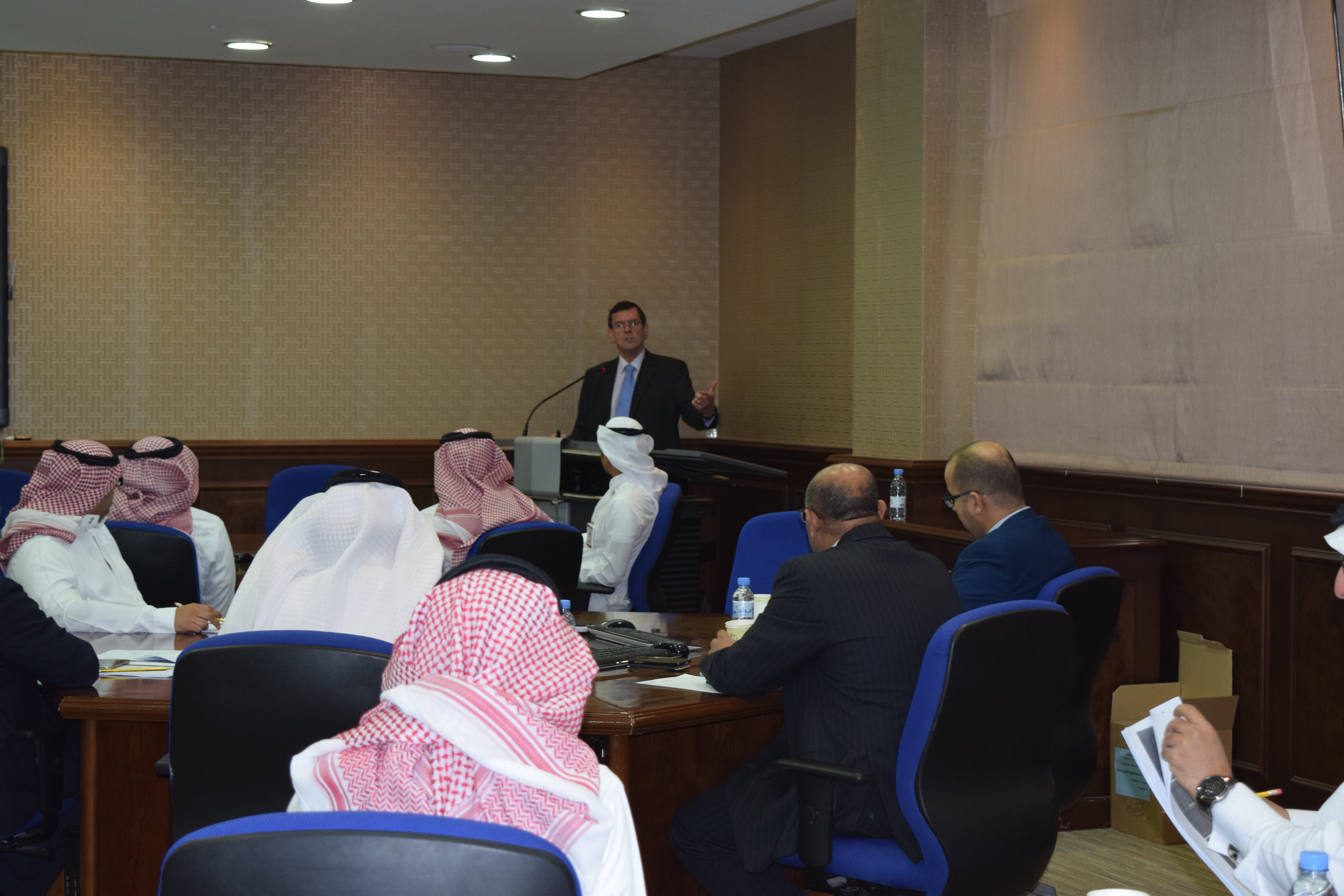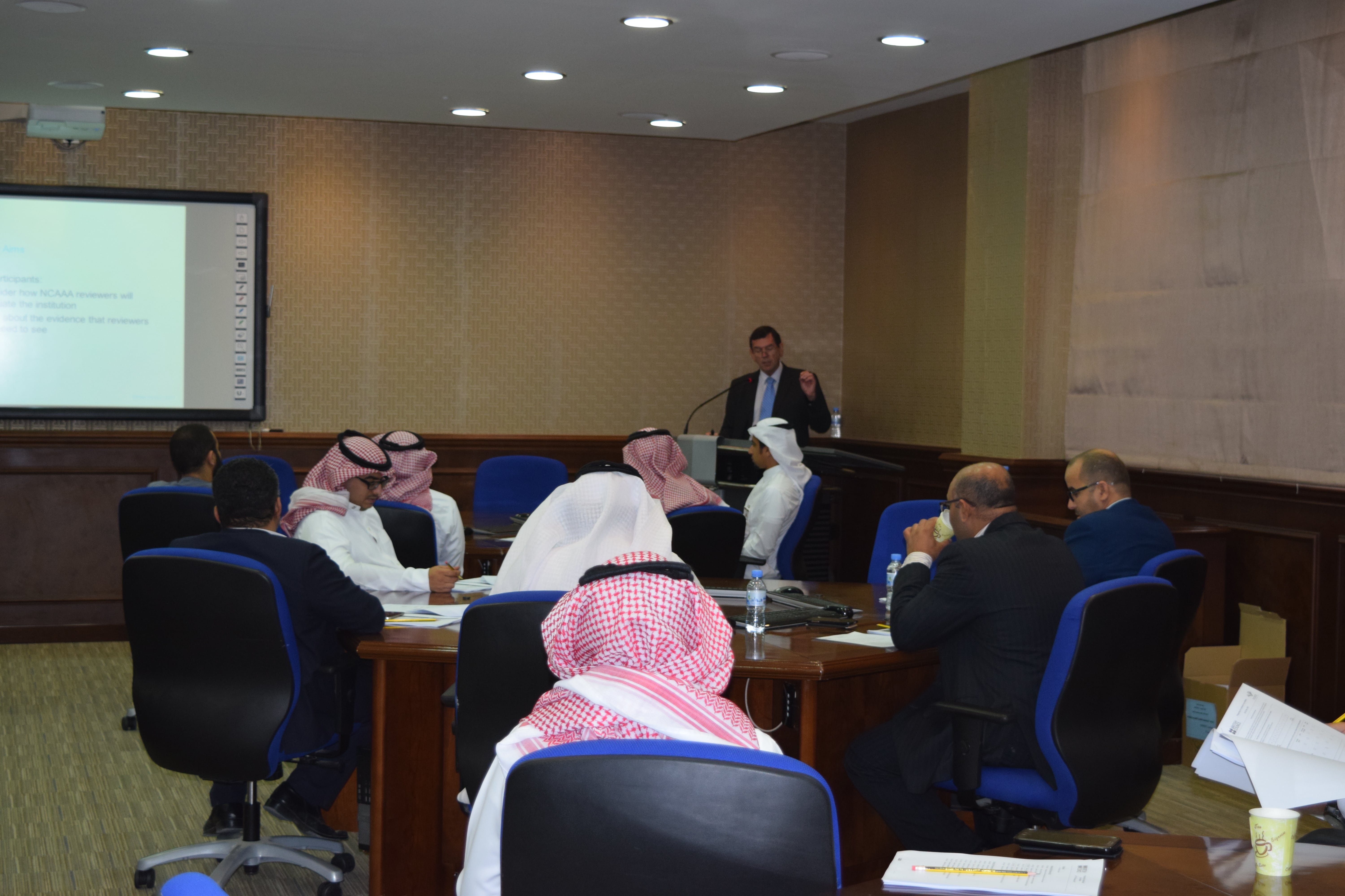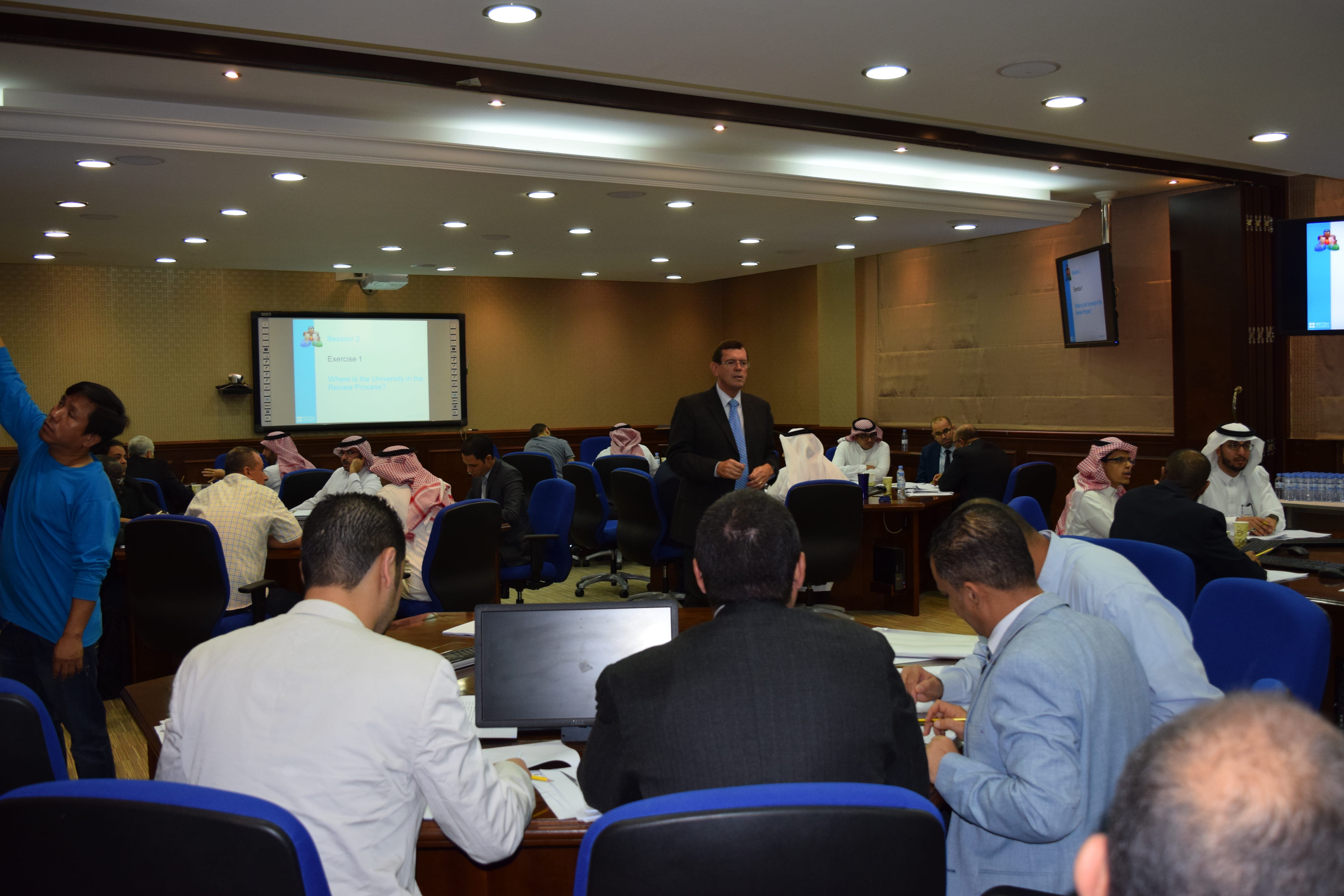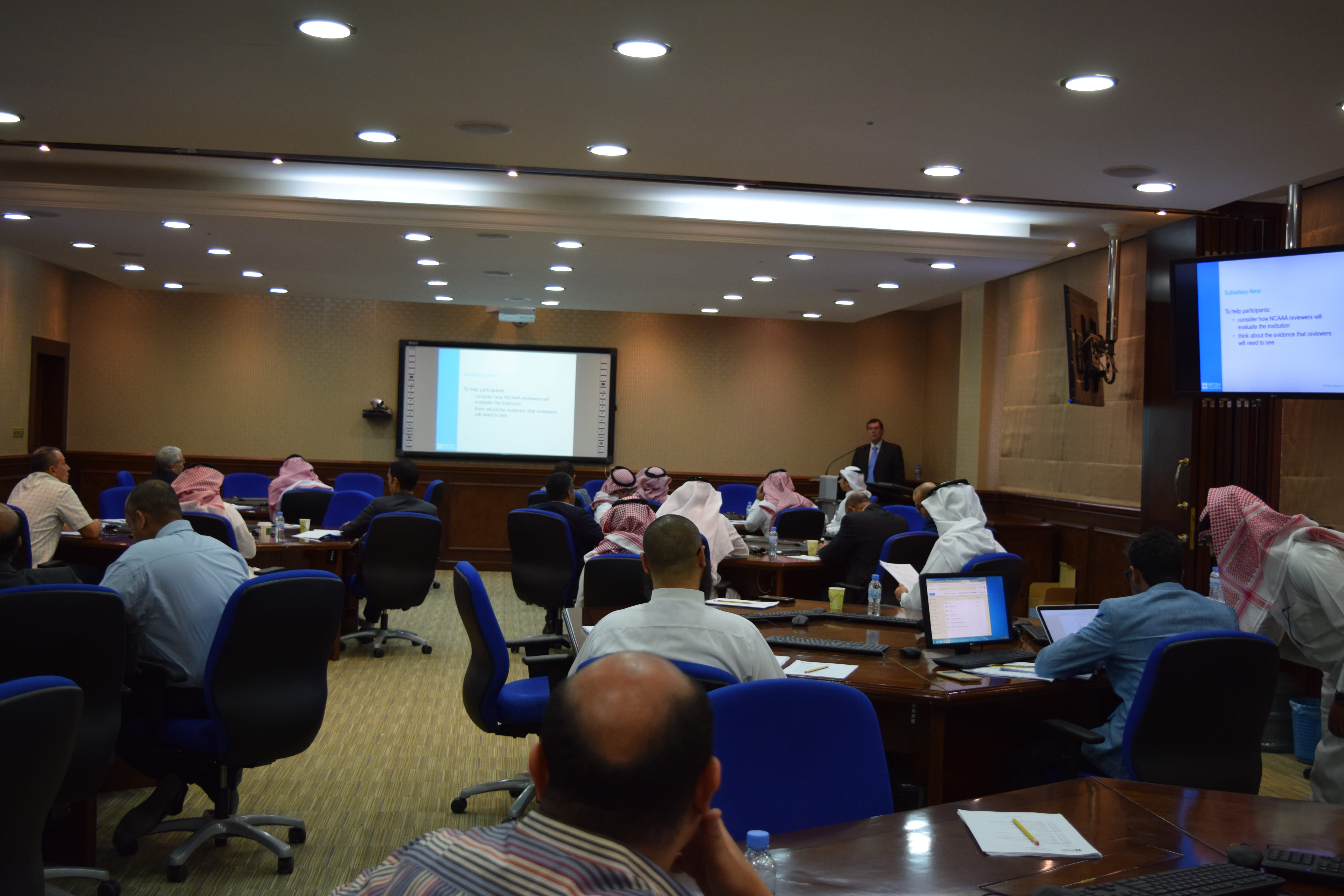 بعد ذلك شرع البروفسر هدسون بالتعريف بالأهداف الرئيسية والفرعية للورشة وكذلك طريقة العمل خلال الورشة. وأوضح سعادته أن عملية المراجعة والتأهيل للاعتماد تتم على مراحل متعددة طبقاً لنظام المركز الوطني للتقويم والاعتماد الأكاديمي، يأتي في مقدمتها الإعداد الجيد للدراسة الذاتية للجامعة، واختيار مؤشرات أداء تساعد على التطوير والتحسين المستمر لكافة وحدات الجامعة الأكاديمية والإدارية وليس على أساس سهولة القياس، وكذلك التحضير المسبق لاجتماعات فريق المراجعة ويتأتى ذلك من خلال العمل التشاركي بين جميع الأطراف ( المستفيدين الداخلين والخارجيين) للجامعة. وفي نهاية الورشة قام البروفيسور بيتر هدسون بعملية محاكاة لاجتماع فريق المراجعة بمنسوبي الجامعة والذي اظهر فيه الحضور مشاركة فعالة و تناغما في الأداء مما أشاد به المدرب بان تلك هي البداية الصحيحة للحصول على الاعتماد الأكاديمي.