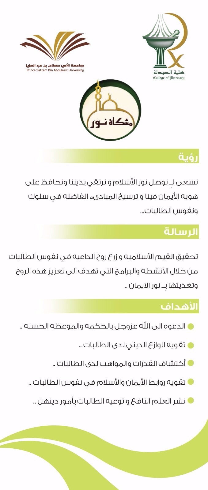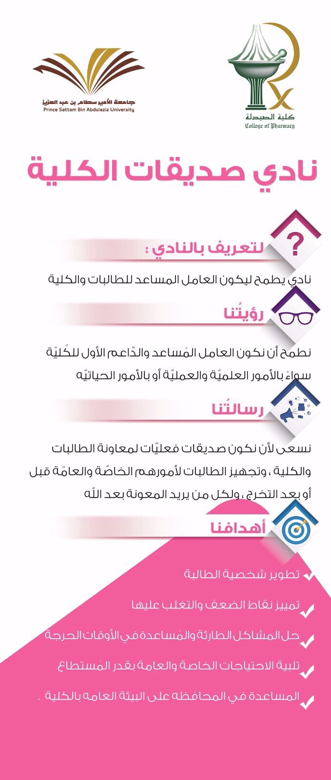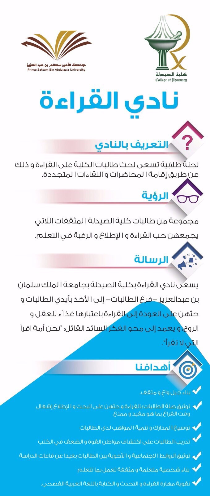 قام فريق المراجعة من عمادة التطوير والجودة- شطر الطالبات و المكون من د. مستورة الشمري- د. نجلاء مصطفى – د. عبير الحكيم – أ. البندري الحماد بزيارة أقسام الطالبات بكلية الصيدلة وذلك يوم الخميس الموافق 23\1\1437هـ الساعة 9:30 صباحا بهدف دعم ومتابعة برامج الجودة في كليات جامعة الأمير سطام بن عبدالعزيز،وقد كان في استقبال الفريق مساعدة عميد الكلية أ.د.أماني عواد ومديرة الإدارة الصيدلانية إسراء العثمان؛ حيث قام الفريق بعمل جولة ميدانية على جميع مرافق الكلية شملت المعامل الطلابية والبحثية حيث تم إعطاء شرح موجزعن وظيفة كل معمل والتجهيزات الموجودة فيها بالإضافة إلى المرور على القاعات الدراسية ومكاتب أعضاء هيئة التدريس ومكتبة الكلية والمصلى والكافتيريا وأخيرًا مقر النوادي الطلابية بالكلية حيث قامت رئيسة كل نادٍ من الطالبات بإعطاء شرح موجز عن رؤية ورسالة النادي والأنشطة التي يقوم بها النادي صاحب ذلك أركان مميزة لكل نادٍ من عمل الطالبات نالت استحسان فريق الزيارة، كما التقى الفريق أعضاء هيئة التدريس وطالبات المجلس الطلابي بعد ذلك تم الاطلاع على وثائق ومستندات الجودة الخاصة بأقسام الطالبات ثم ختم الفريق الزيارة بتقديم الشكر والعرفان على الجهود المبذولة والملموسة من الكلية لتحقيق الجودة وتحسين البرامج الموجودة في الكلية.