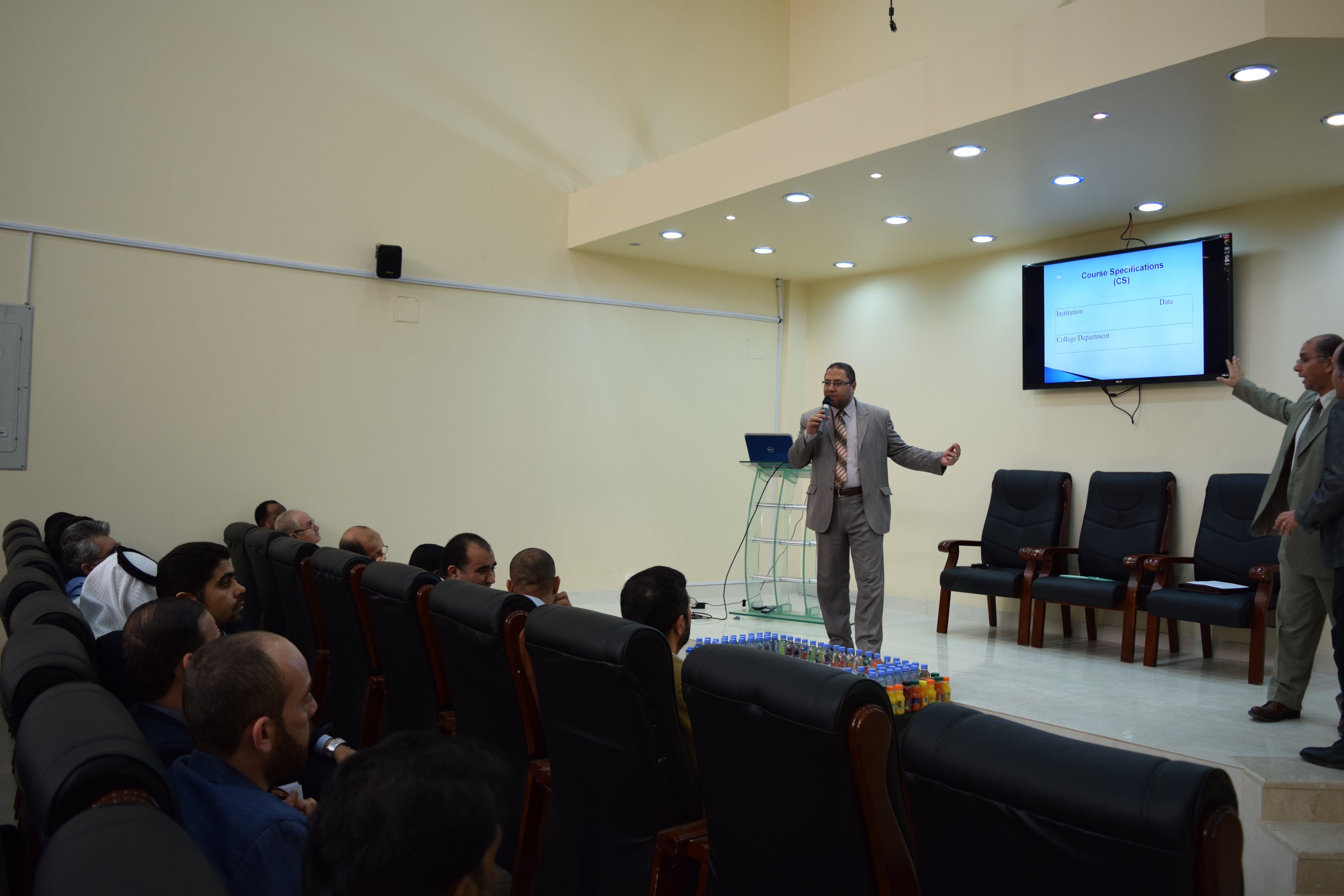 سعيا من عمادة التطوير والجودة لنشر ثقافة الجودة طبقاً لأحدث إصدارات الهيئة الوطنية للتقويم والاعتماد الأكاديمي، نظمت العمادة ورشة عمل بعنوان "توصيف المقرر الدراسي طبقا لمعايير الهيئة الوطنية للتقويم والاعتماد الأكاديمي ". قدمت الورشة من قبل سعادة الدكتــــور/ عيــــد رجب ابو عز وسعادة الدكتور /السيد ابراهيم سليــــم، مستشارا عمادة التطوير والجودة. وافتتحت الورشة بالتنويه على أهمية دور السنة التحضيرية في تأهيل الطلاب للدخول في الحياة الجامعة ومعالجة القصور في مستوى اللغة الإنجليزية لديهم ليتمكنوا من الانطلاق في الدراسة الجامعية دون تعثر او صعوبات. ومن هذا المنطلق تظهر أهمية توصيف المقرر/ المقررات الدراسية في تلك المرحلة، لذا ركزت الورشة على أهمية توصيف المقرر الدراسي واكساب المتدربين المهارات والخبرات المتعلقة بكيفية صياغة توصيف مقرر دراسي طبقا لأحدث اصدارات الهيئة الوطنية للتقويم والاعتماد الأكاديمي (فبراير، 2015). وقد تميزت الورشة التدريبية بحضور عدد كبير من أعضاء هيئة التدريس (80 متدربا) ممثلين كافة المسارات الأكاديمية في عمادة السنة التحضيرية.
