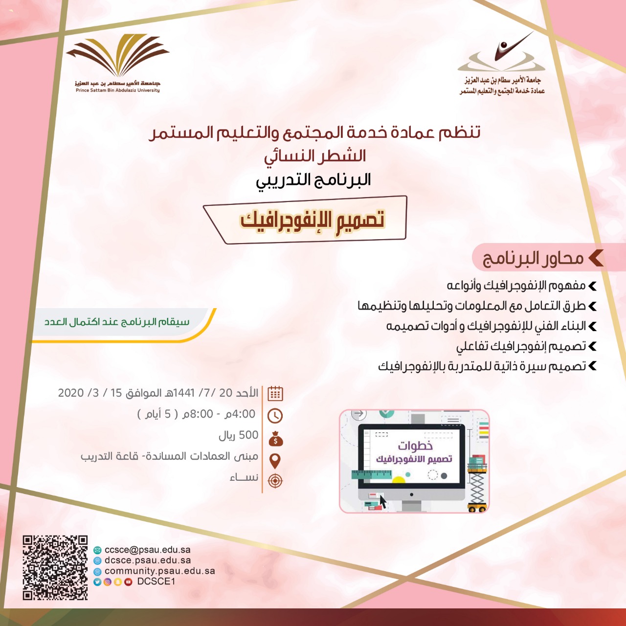 تعلن عمادة خدمة المجتمع والتعليم المستمر(القسم النسائي) في جامعة الأمير سطام عن إقامة البرنامج التدريبي :تصميم الإنفوجرافيك حيث ينطلق البرنامج مساء الأحد 20/07/1441هـ الموافق 15/03/2020 م لمدة (5) أيام وذلك في قاعة التدريب بمبنى العمادات المساندة.