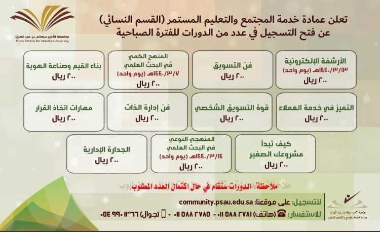 ضمن برامجها في تنمية المجتمع ،تعلن عمادة خدمة المجتمع والتعليم المستمر بجامعة الأمير سطام (القسم النسائي) عن عزمها إقامة عدد من الدورات التدريبية في الفترة الصباحية على النحو التالي:
